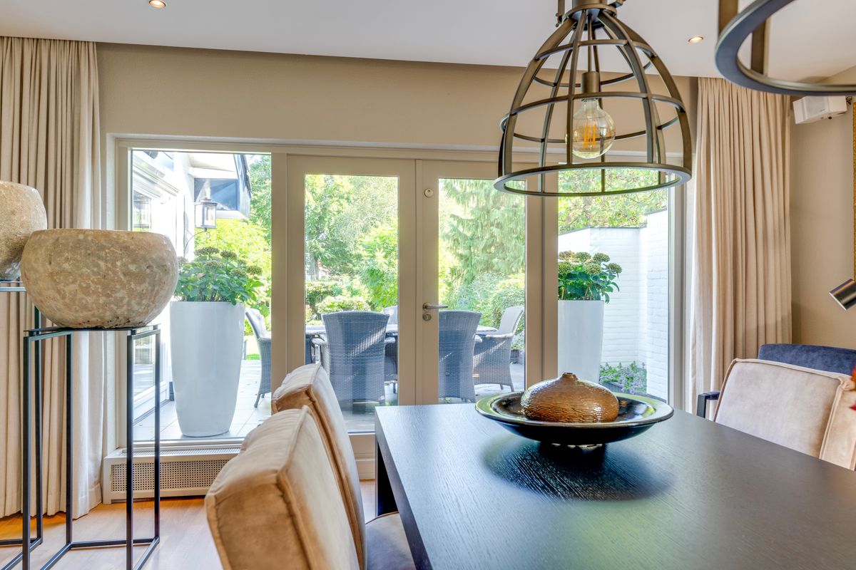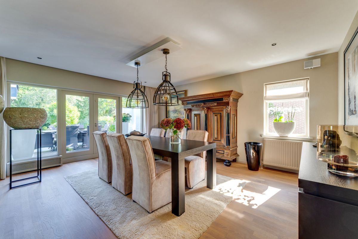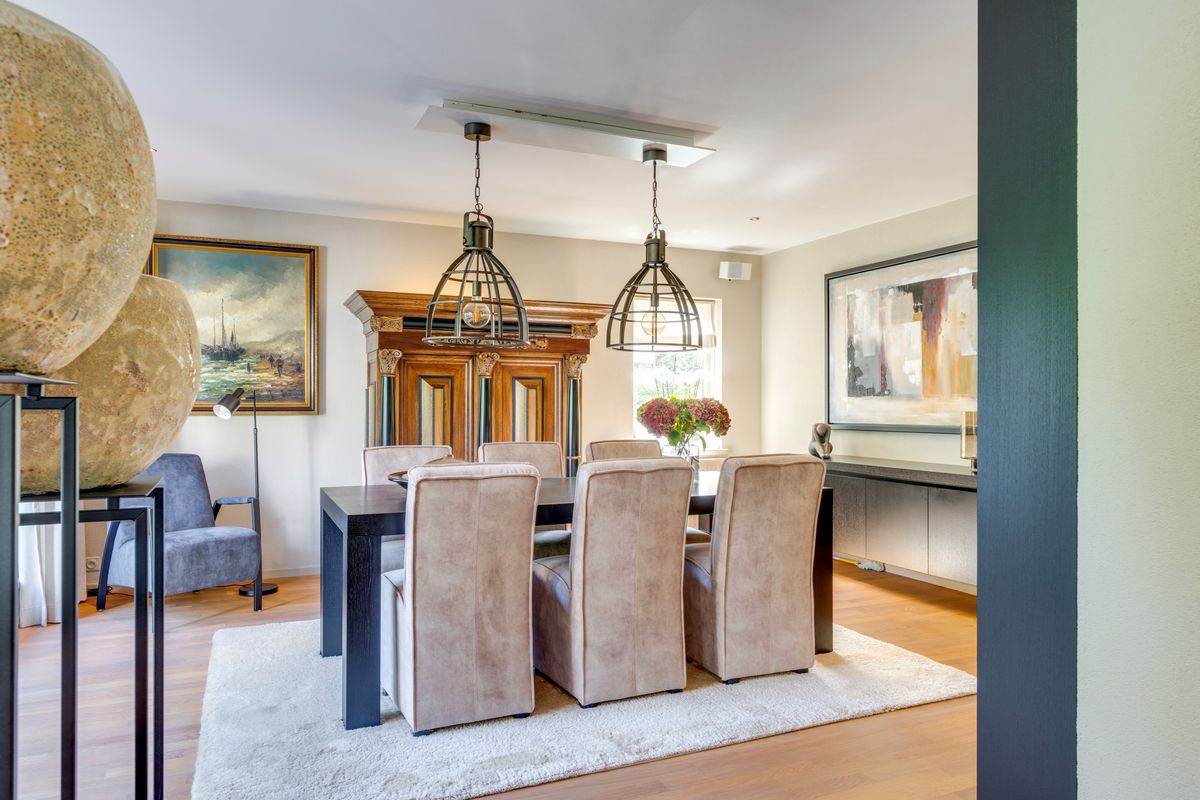 Via de royale entree kom je binnen in een lichte hal met trapopgang, garderobe en gastentoilet. Vanuit hier stap je de indrukwekkende living binnen: een riante, open ruimte met grote raampartijen die zorgen voor een overvloed aan daglicht en een prachtig uitzicht op de tuin. De zithoek met sfeervolle haard nodigt uit om heerlijk te ontspannen, terwijl je in de eethoek alle ruimte hebt voor lange diners met familie en vrienden. Op de vloer ligt een prachtige parketvloer, die warmte en karakter geeft aan het geheel. Vanuit de woonkamer leiden openslaande deuren je naar het ruime terras, waar je volop kunt genieten van het buitenleven. De keuken is apart gesitueerd en biedt volop werk- en opbergruimte. Hier beschik je over diverse inbouwapparaten, waaronder een Miele magnetron, 4-pits inductiekookplaat, vaatwasser, koelkast en een close-in boiler. Een praktische en complete ruimte waar koken een plezier wordt. Direct naast de keuken bevindt zich de bijkeuken, met aansluitingen voor wasmachine en droger. Een fijne plek waar je alle huishoudelijke taken handig en uit het zicht kunt regelen.