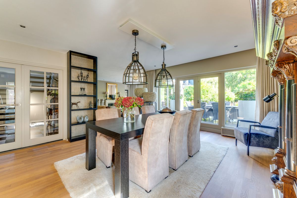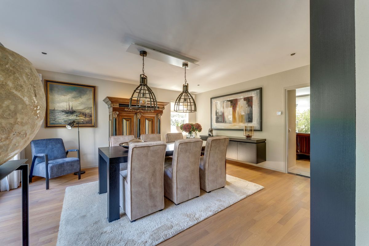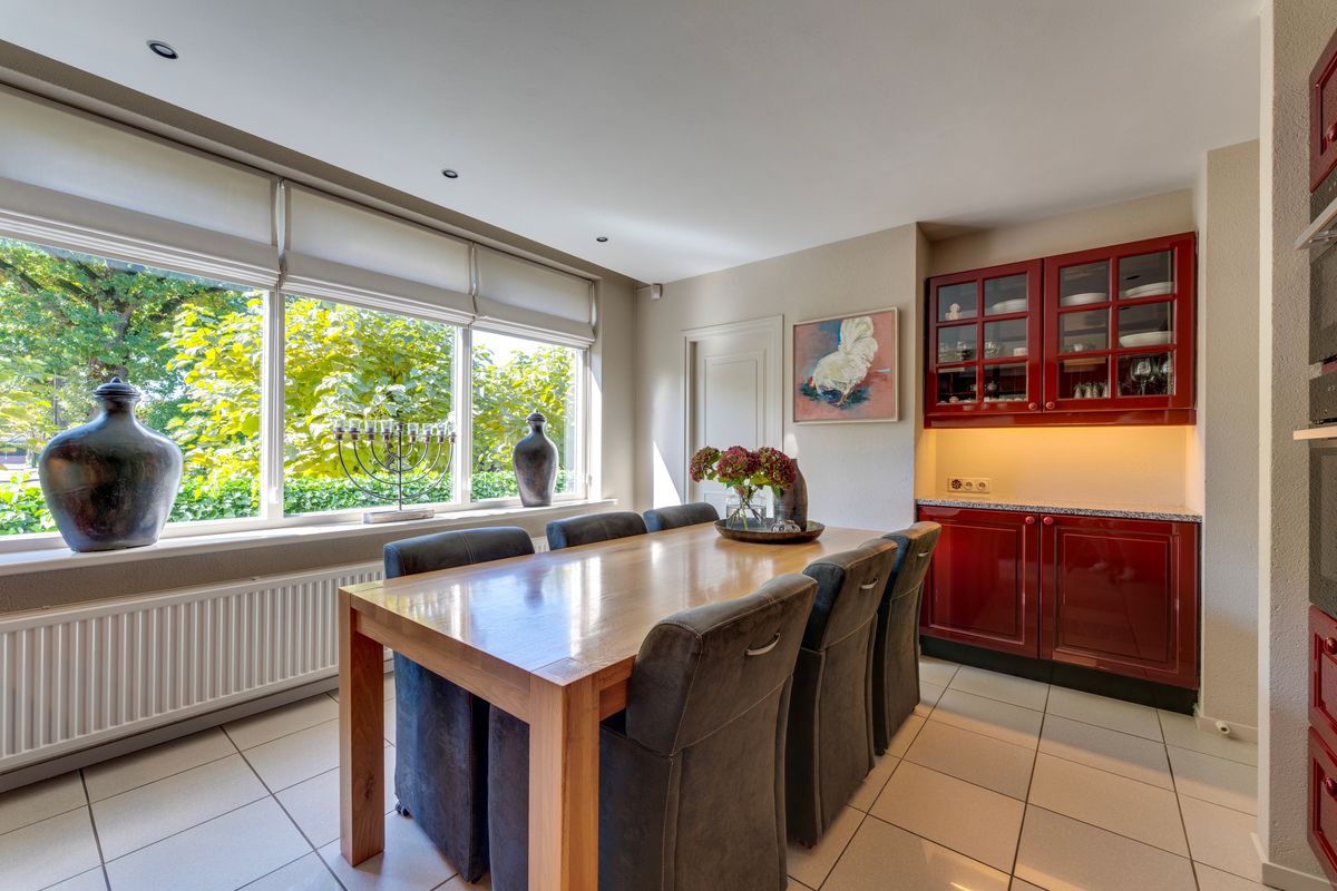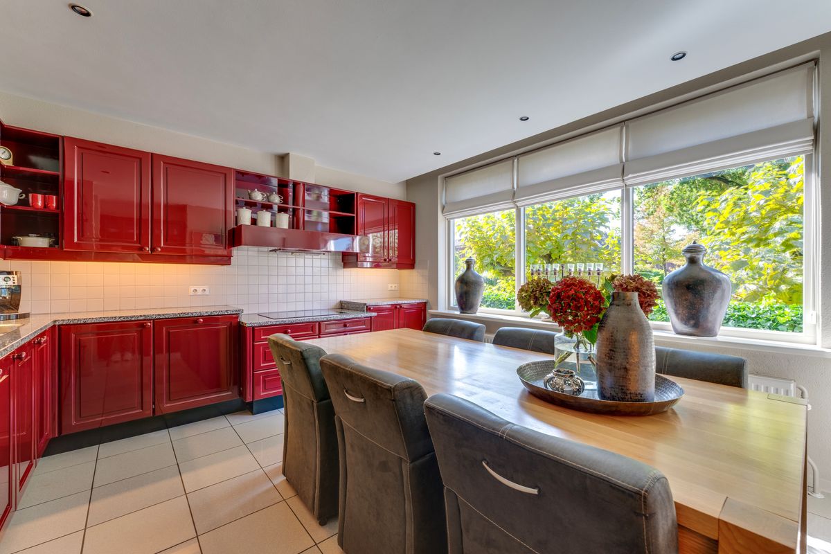 Via de royale entree kom je binnen in een lichte hal met trapopgang, garderobe en gastentoilet. Vanuit hier stap je de indrukwekkende living binnen: een riante, open ruimte met grote raampartijen die zorgen voor een overvloed aan daglicht en een prachtig uitzicht op de tuin. De zithoek met sfeervolle haard nodigt uit om heerlijk te ontspannen, terwijl je in de eethoek alle ruimte hebt voor lange diners met familie en vrienden. Op de vloer ligt een prachtige parketvloer, die warmte en karakter geeft aan het geheel. Vanuit de woonkamer leiden openslaande deuren je naar het ruime terras, waar je volop kunt genieten van het buitenleven. De keuken is apart gesitueerd en biedt volop werk- en opbergruimte. Hier beschik je over diverse inbouwapparaten, waaronder een Miele magnetron, 4-pits inductiekookplaat, vaatwasser, koelkast en een close-in boiler. Een praktische en complete ruimte waar koken een plezier wordt. Direct naast de keuken bevindt zich de bijkeuken, met aansluitingen voor wasmachine en droger. Een fijne plek waar je alle huishoudelijke taken handig en uit het zicht kunt regelen.