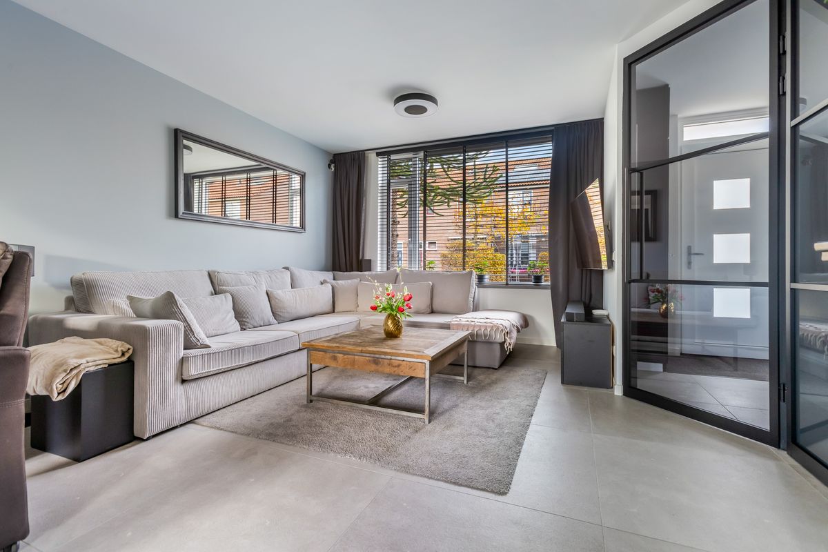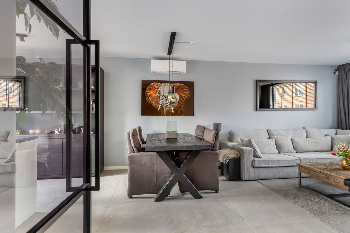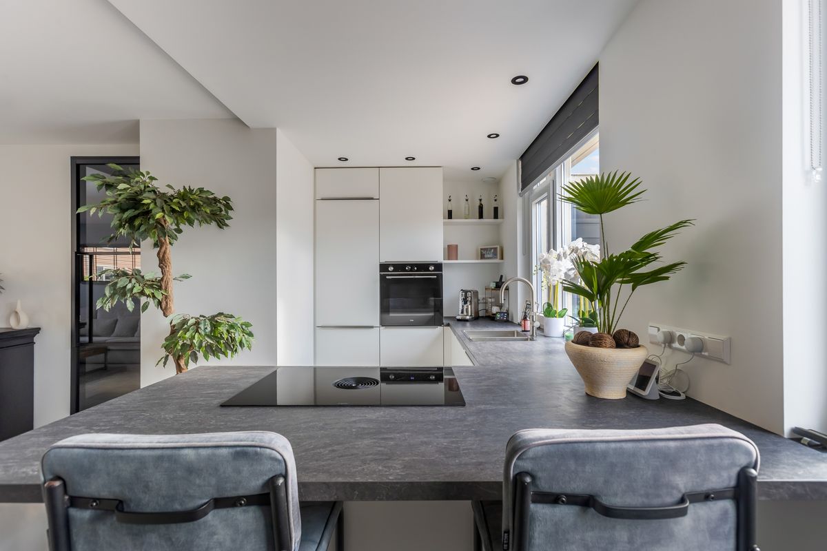 Via de hal met toilet en trapopgang kom je in de lichte woonkamer met tegelvloer en vloerverwarming. De ruimte heeft een prettige indeling met grote ramen en een open verbinding naar de keuken. Deze moderne keuken aan de voorzijde is uitgerust met hoogwaardige inbouwapparatuur: een inductiekookplaat met geïntegreerde afzuiging, combi-oven, Quooker, dubbele spoelbak, vaatwasser, koelkast en vriezer. Een heerlijke plek om te koken en gezellig samen te eten.