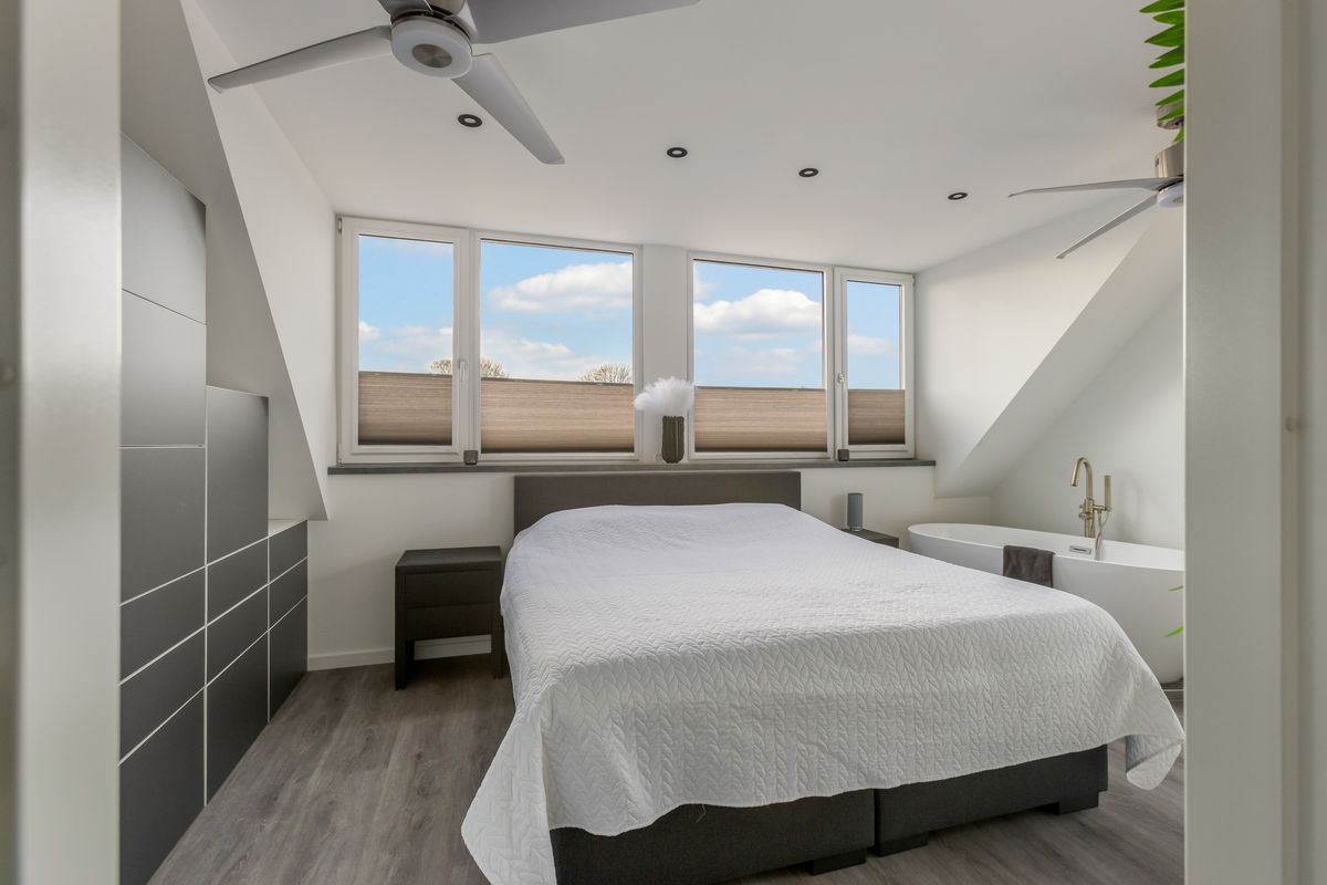 De eerste verdieping telt twee ruime slaapkamers, beide voorzien van een PVC-vloer en airconditioning. De hoofdslaapkamer aan de achterzijde beschikt bovendien over een stijlvol bad en biedt toegang tot een riant balkon/terras van circa 17 m², gesitueerd boven de aangebouwde garage – een heerlijke plek om in alle privacy van de zon te genieten. De moderne badkamer is smaakvol afgewerkt en voorzien van een inloopdouche, dubbele wastafel met verwarmde en verlichte spiegel en een tweede toilet.