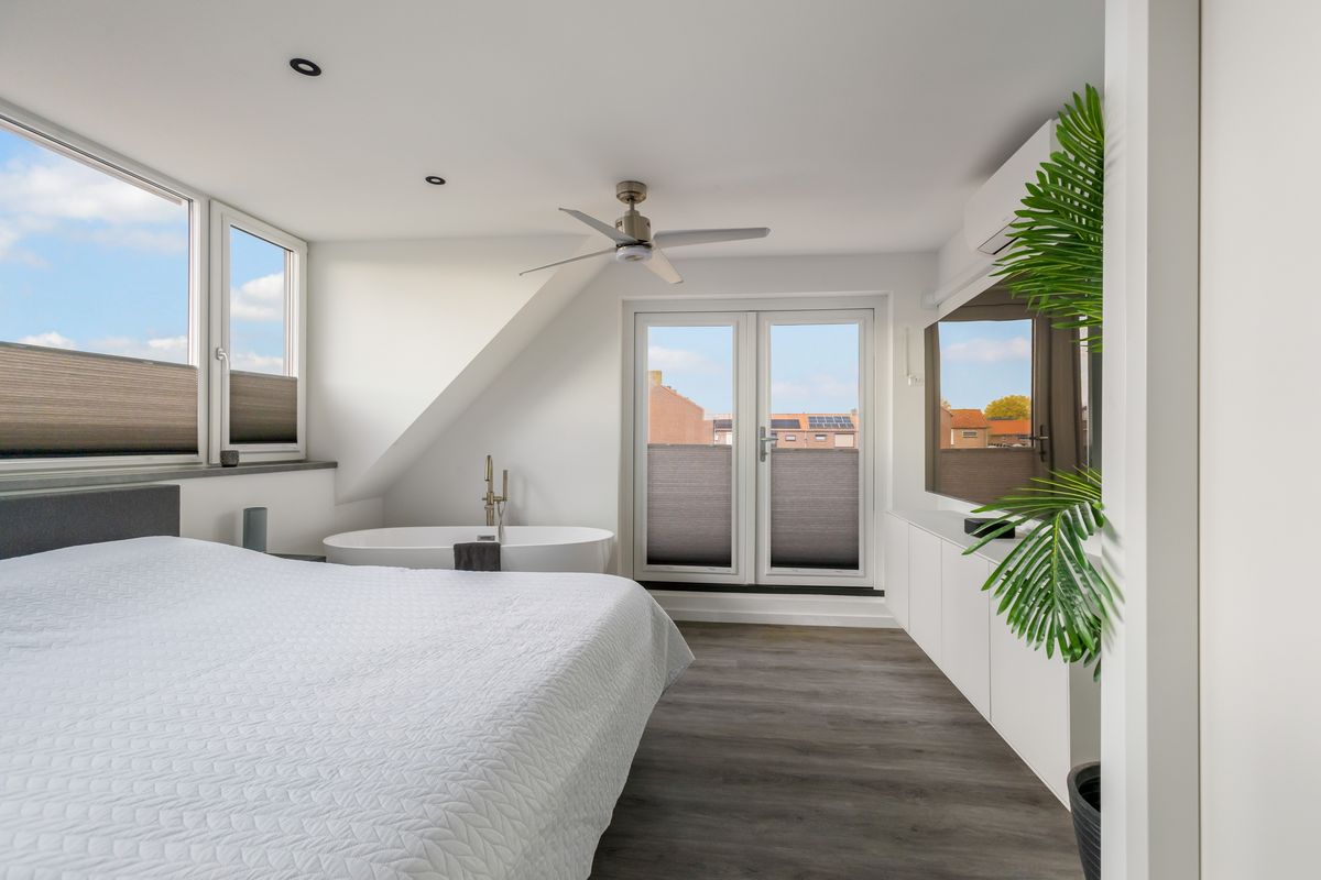 De zolderverdieping is verrassend ruim dankzij de brede dakkapel. Hier bevindt zich de derde slaapkamer, afgewerkt met een PVC-vloer en voorzien van airconditioning. Daarnaast is op deze verdieping de aansluiting voor de wasmachine aanwezig – praktisch en netjes weggewerkt.
