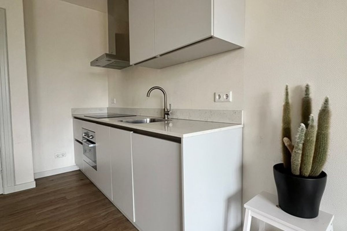 De open keuken is voorzien van een vaatwasser, oven, inductieplaat en koelkast.