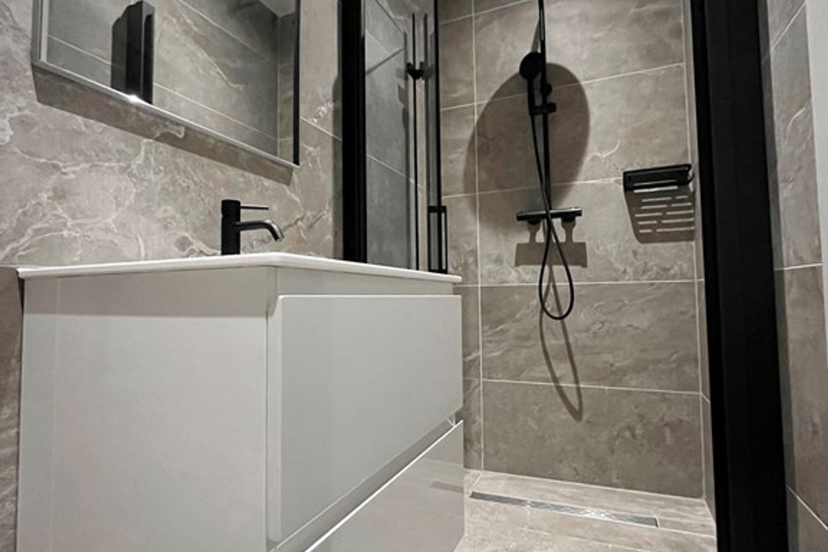 The bathroom is equipped with a sink, heated towel rail, and shower.