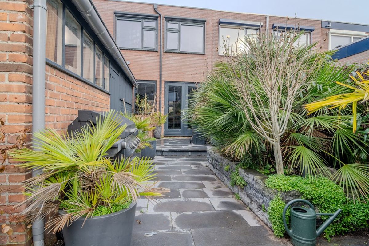 De ruime berging (3.46 x 1.96) in de achtertuin biedt ruimte voor de fietsen, opslag en op dit moment zit de wasmachine-aansluiting hier. Aan de voorzijde van de woning heb je nog een klein stukje voortuin (1.78 x 5.58) welke nu omheind is met een haag.