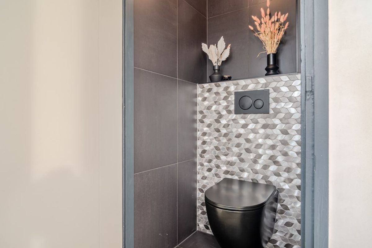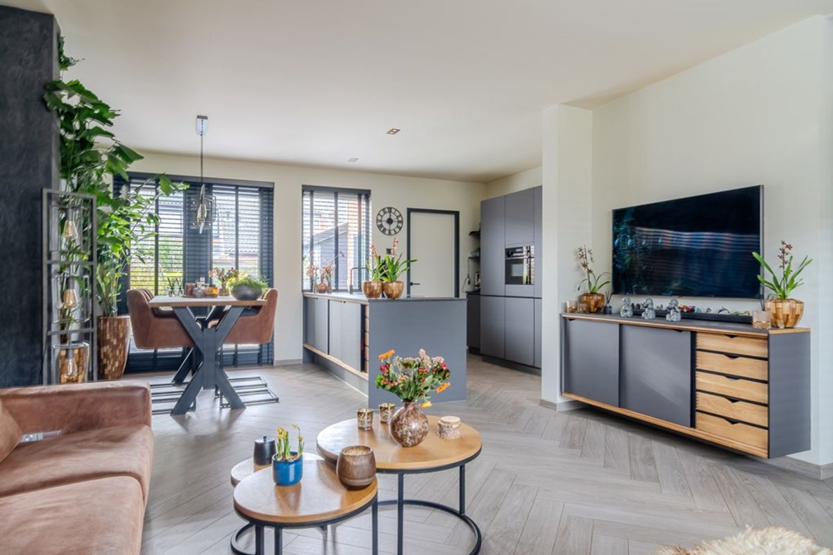 Entree van de woning is aan de achterzijde. Van Waningstraat 5 en 7 lopen via de rechterzijde de poort in, langs de woningen naar de achtertuin. Via de schutting kom je in de zonnige achtertuin van bijna 14 meter diep. Deze is verzorgd aangelegd met borders en straatwerk. Vanaf het voorjaar kun je hier al genieten uit de wind in het zonnetje, omdat de tuin op het zuiden is gelegen. Binnenkomst in de hal, met toegang tot de badkamer, het toilet en de woonvertrekken. De groepenkast vind je in de woonkamer in de vaste kast die gebruikt wordt als extra berging. De woonkamer (5.23 x 4.00) is gelegen aan de voorzijde van de woning met aan de achterzijde de open keuken met eetkamer (5.23 x 3.21). De keuken is in parallel-opstelling geplaatst met heel veel bergruimte door het grote kookeiland. Deze is voorzien van een inductiekookplaat met afzuiging, spoelbak en vaatwasser. In de wandkasten vindt je de combi-oven, koelkast en een handige koffiecorner. Vanuit de hal bij binnenkomst heb je de toegang tot de volledig betegelde badkamer (2.41 x 1.96) met ruime inloopdouche en dubbel wastafelmeubel, en het aparte toilet. De woonvertrekken en badkamer zijn voorzien van een prachtige duurzame tegelvloer met vloerverwarming, de wanden en plafond van glad stucwerk en betoncire.