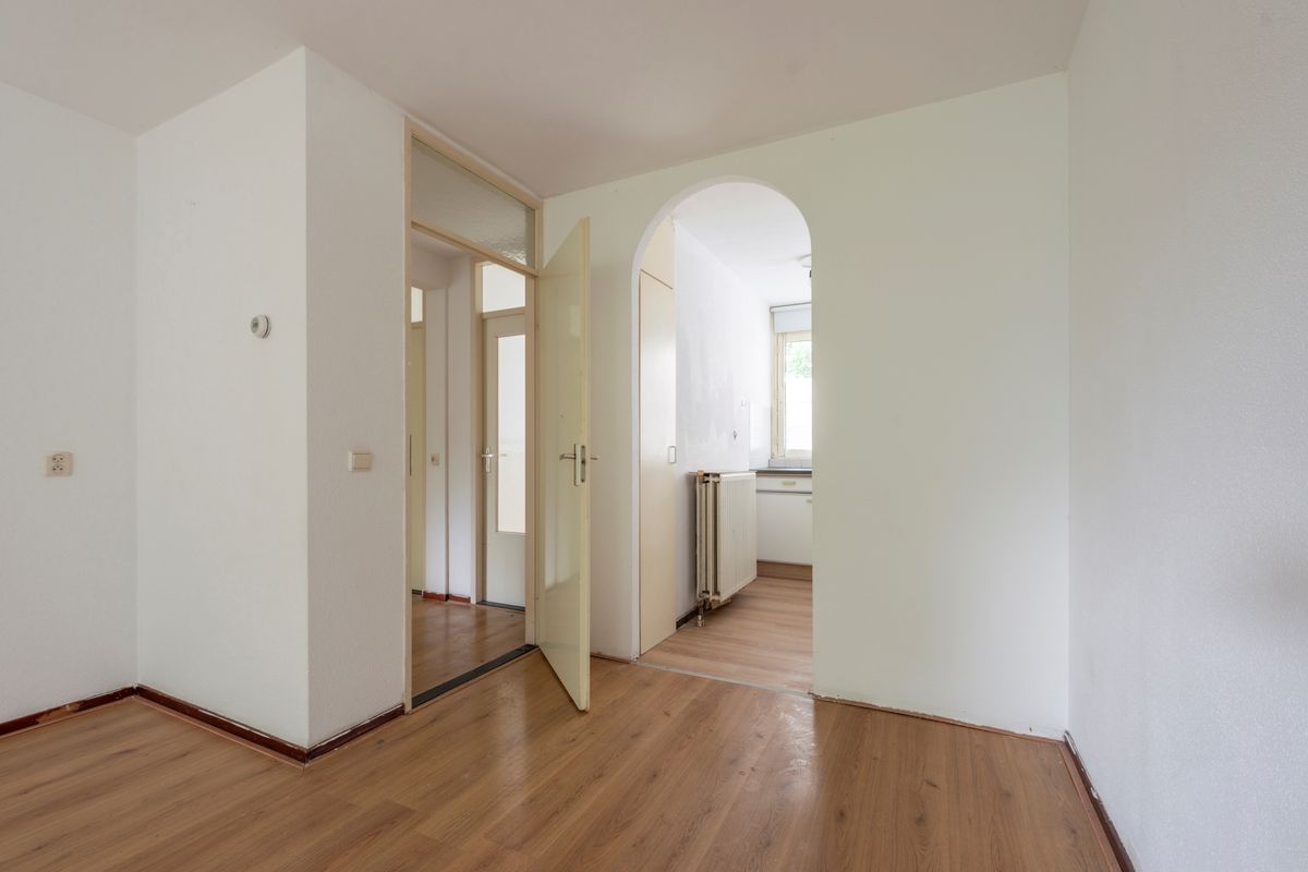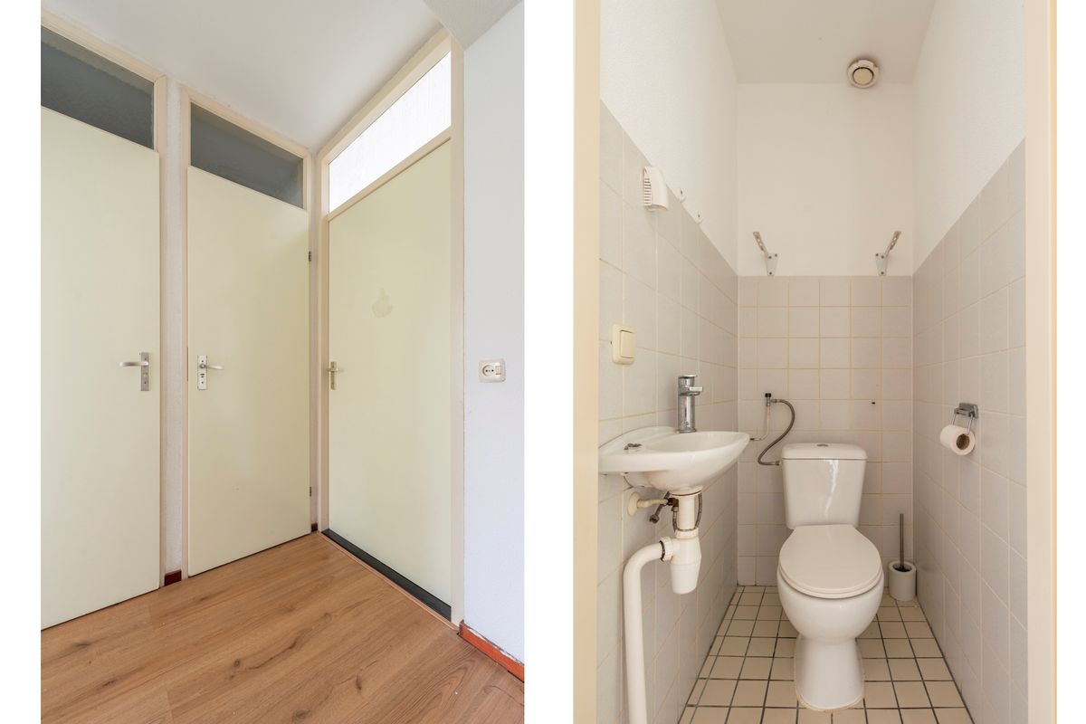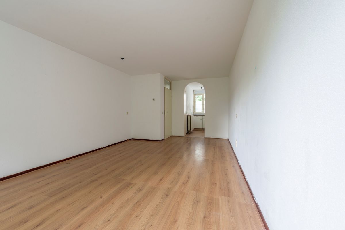 Entree, toilet met fonteintje, lichte woonkamer (6,87 x 3,59) met deur naar balkon,