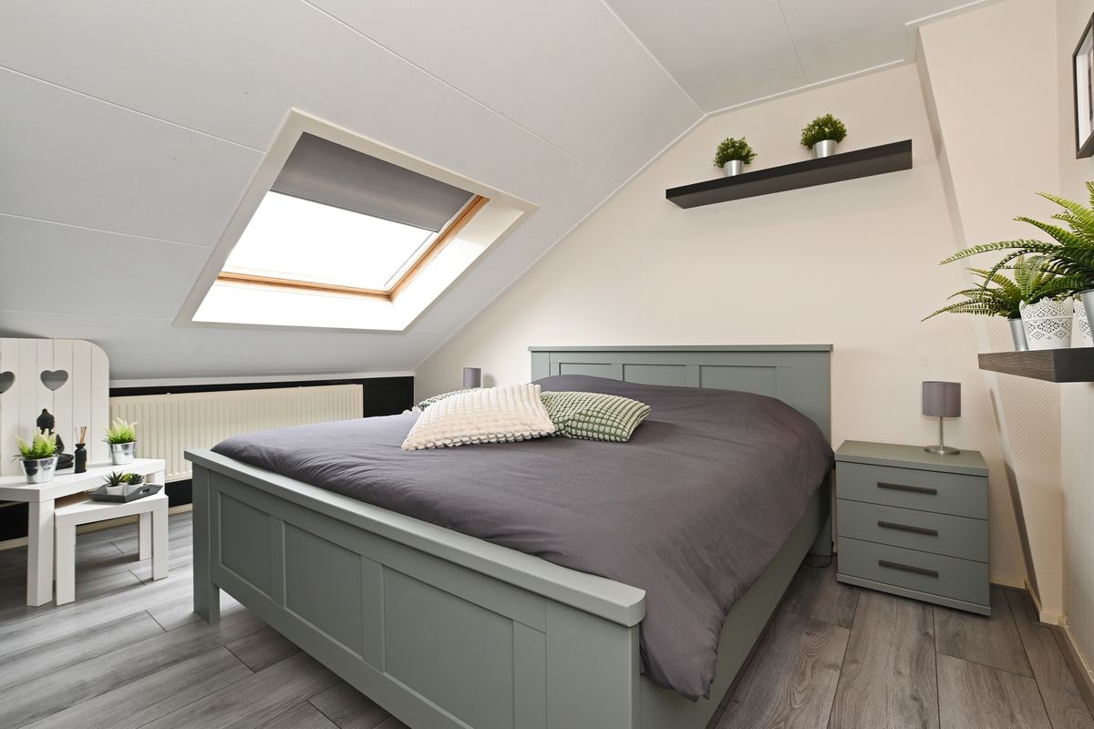 De hoofdslaapkamer is ruim en ligt aan de achterzijde, met prettig lichtinval door het dakraam.