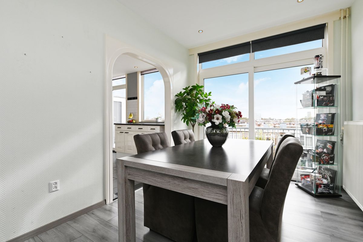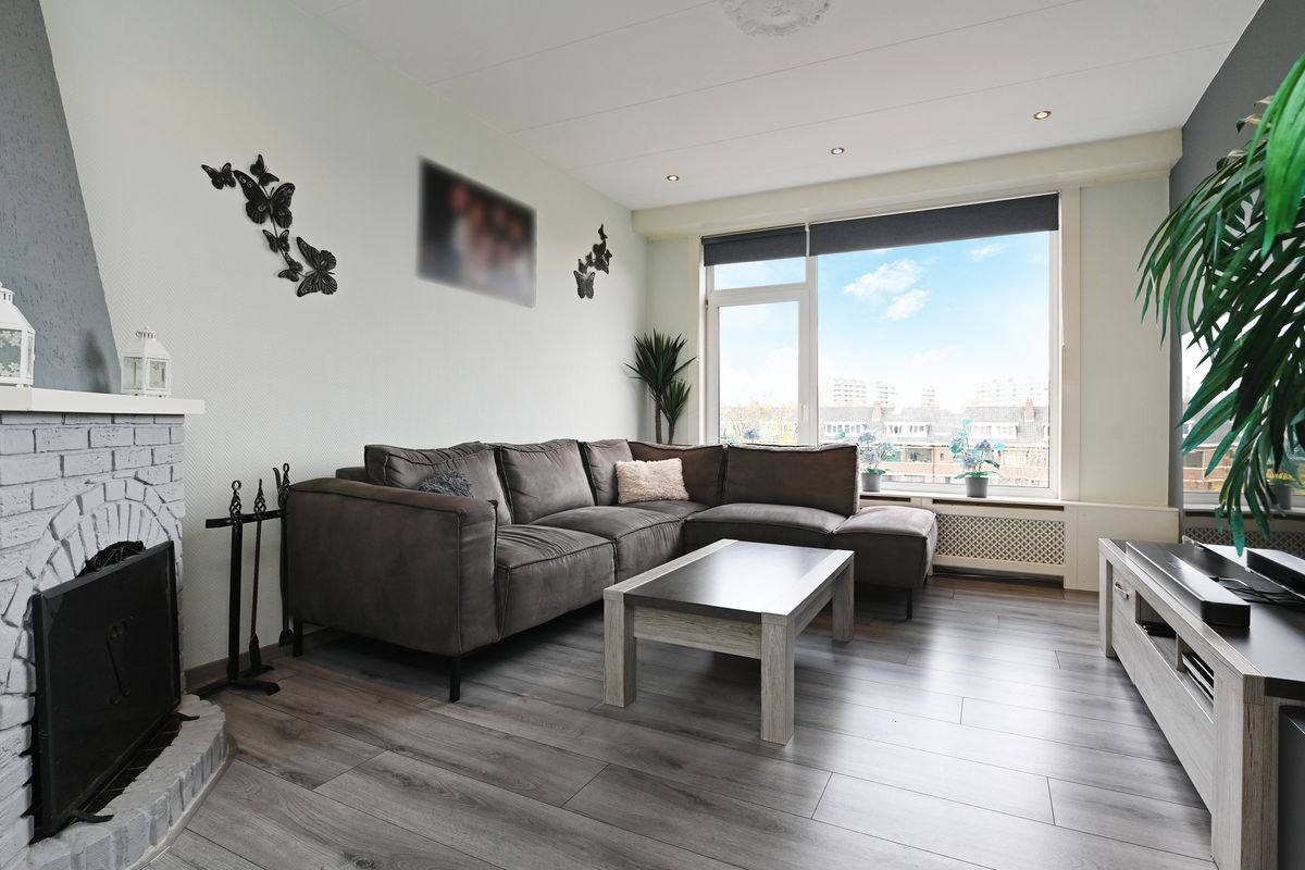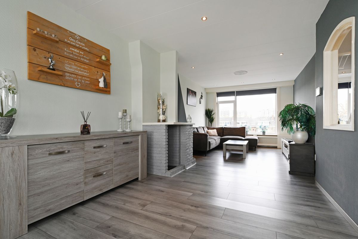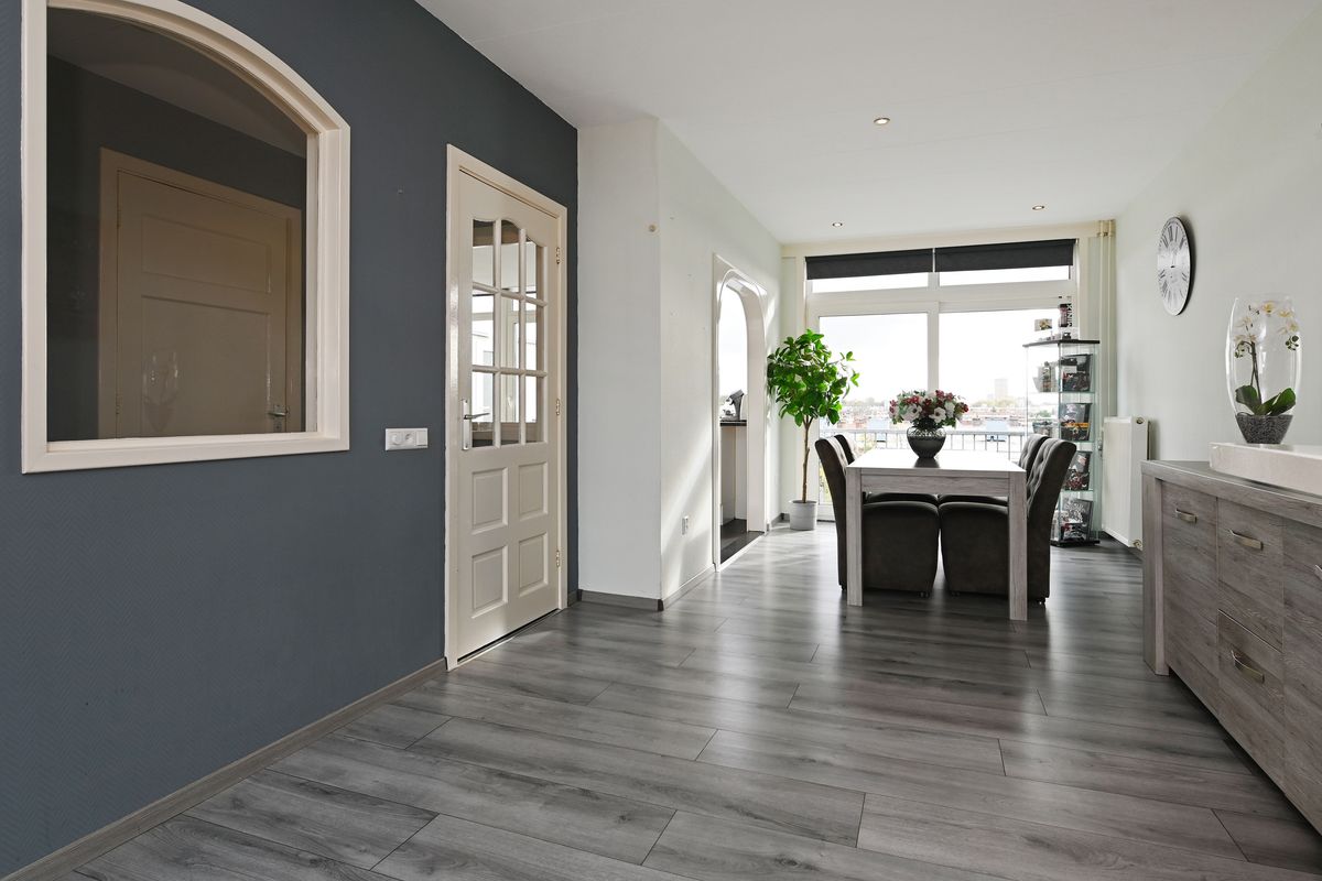 De woon-/eetkamer is royaal en sfeervol, met veel lichtinval door de grote ramen aan weerszijden. Aan de voorzijde kijkt u uit over het water van de kade; aan de achterzijde bevindt zich de eetkamer met aangrenzend het zonnige balkon op het zuidoosten. Hier geniet u van een vrij uitzicht over de stadstuinen en de skyline van Den Haag. De woning heeft karaktervolle details zoals de klassieke schouw met haard (rookkanaal aanwezig, recent niet in gebruik).
