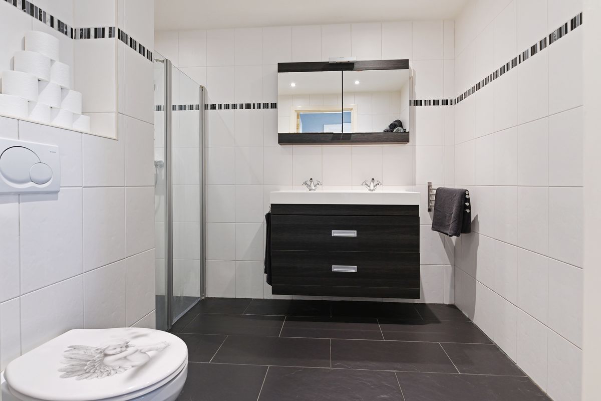 De badkamer is modern en neutraal afgewerkt, met een inloopdouche, zwevend toilet en wastafelmeubel met dubbele kranen.