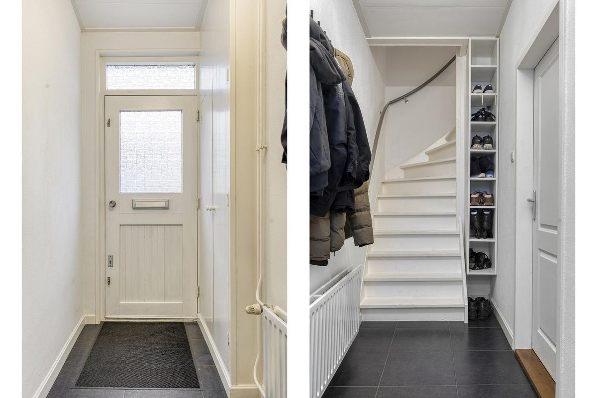 Entree in de hal met fraaie tegelvloer, vernieuwde meterkast, garderobe en trap naar de 1e verdieping.