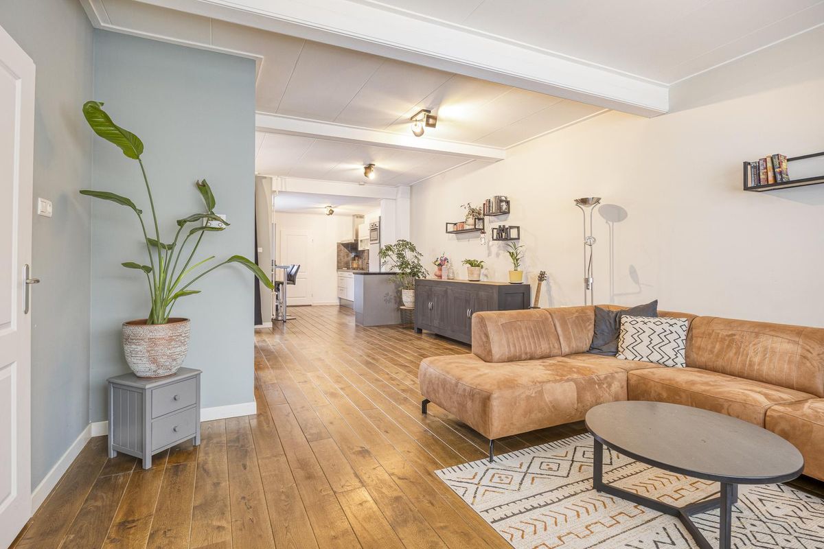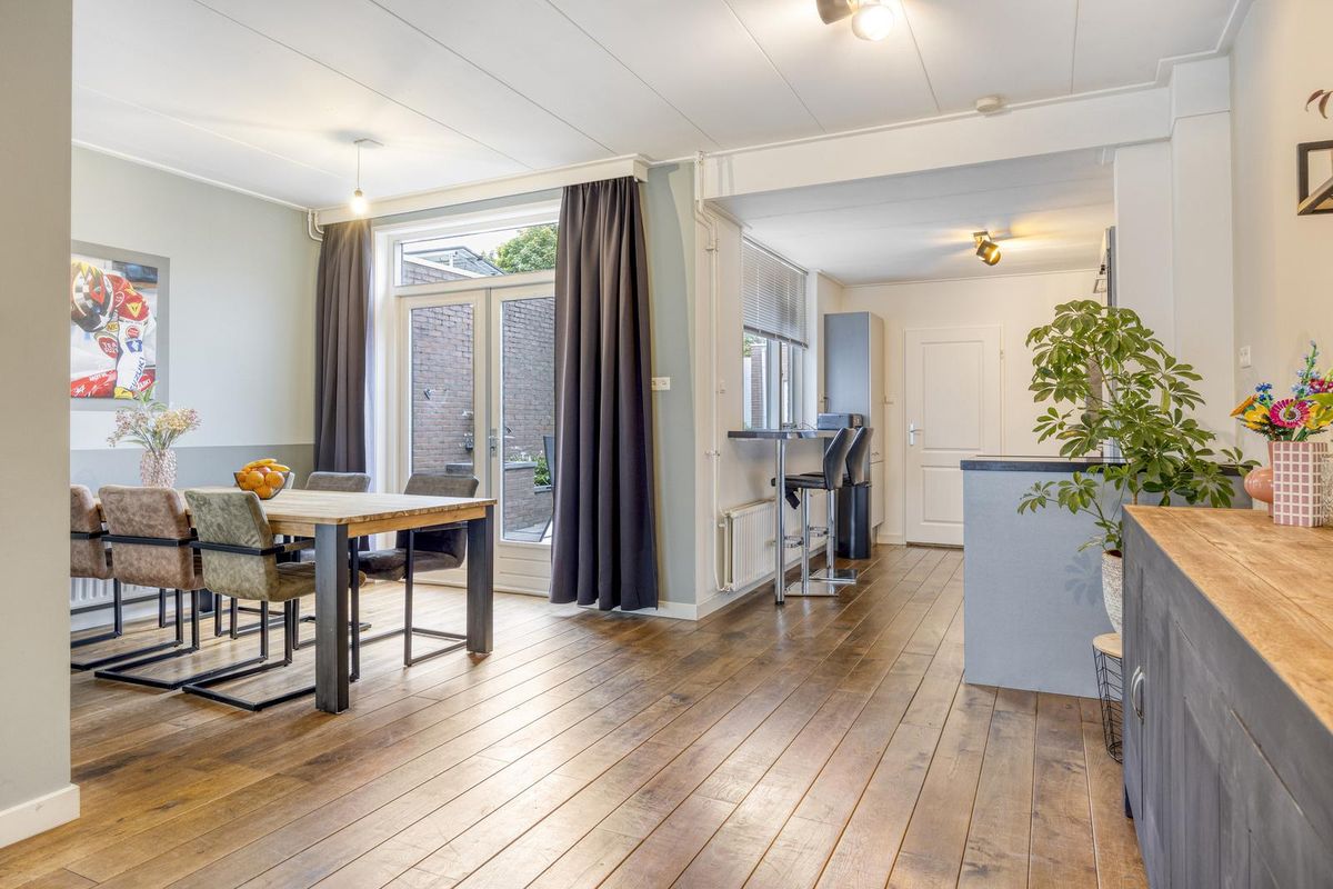 Vanuit de hal is de ruime sfeervolle L-vormige woonkamer met massief eiken vloer, eethoek en tuindeuren naar het terras bereikbaar. De trappenkast in de woonkamer geeft toegang tot de kruipruimte.