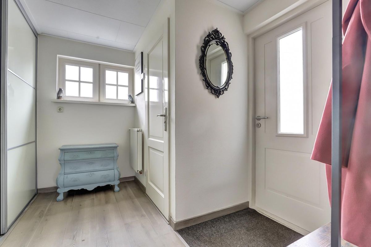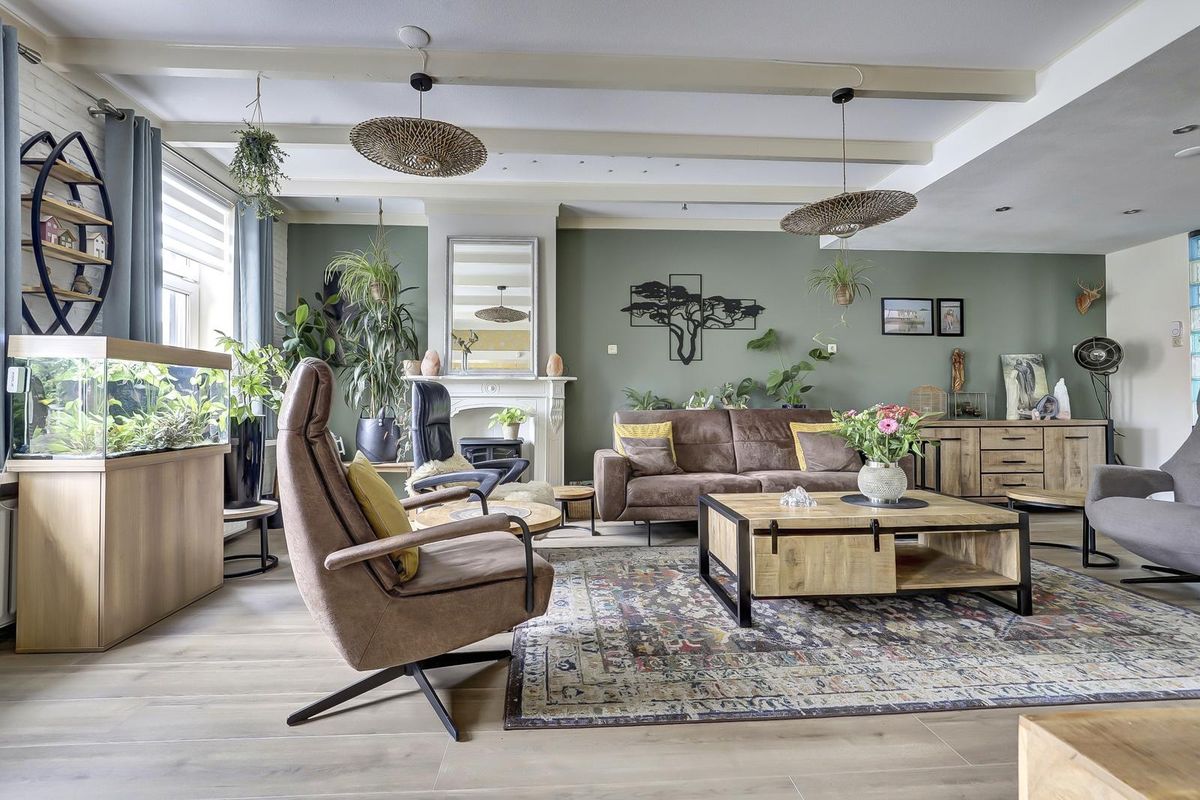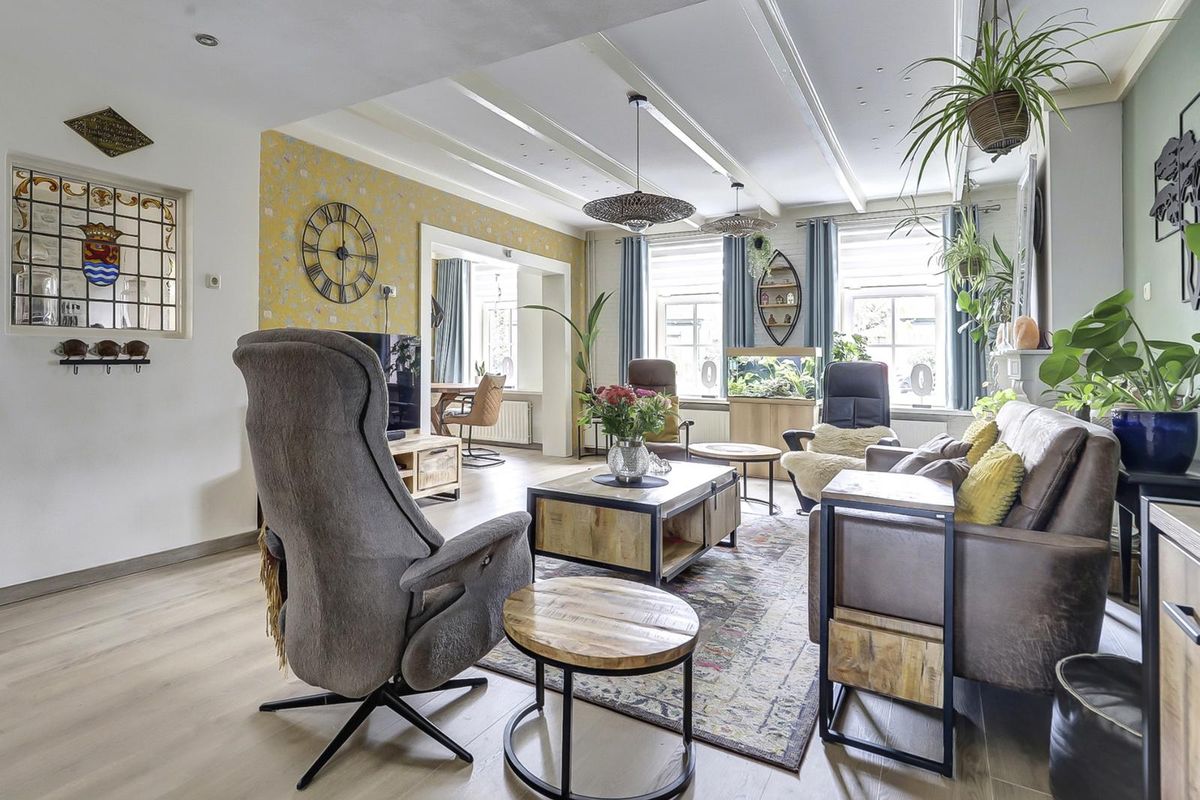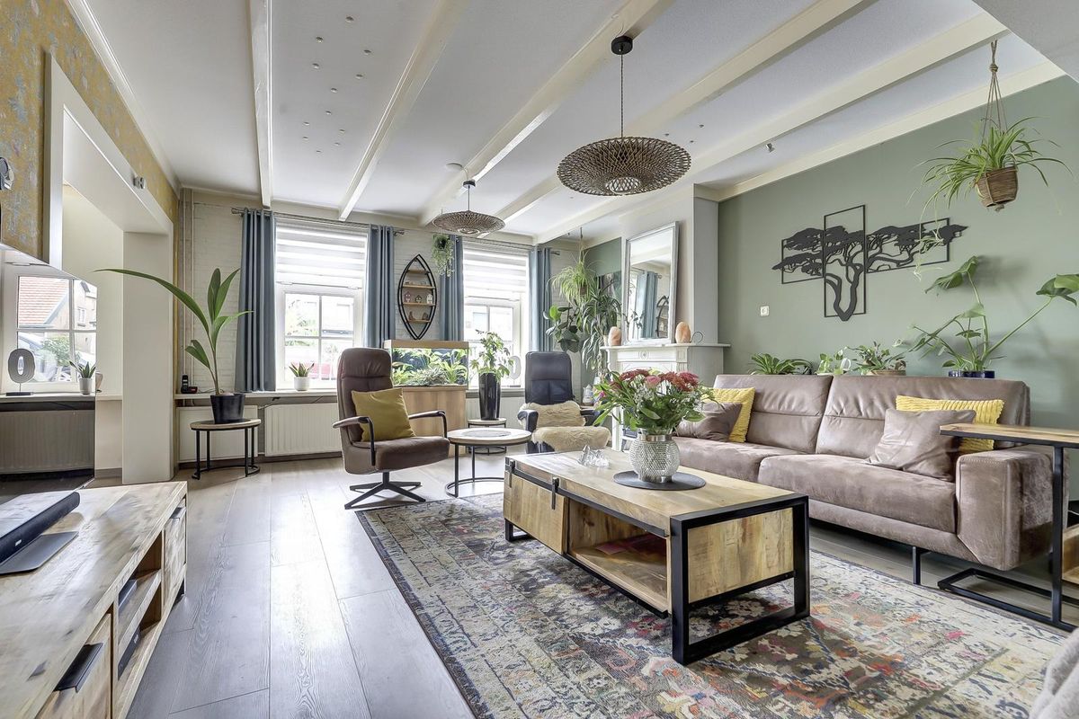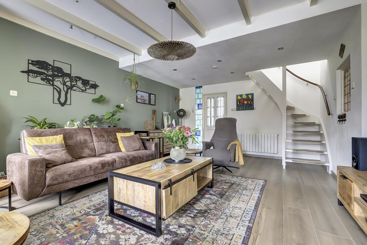 Via de oprit en langs de zijgevel loopt u naar de achterzijde waar zich de voordeur bevindt. U komt binnen in de lichte entree met garderobe, ruime inbouwkast, moderne toiletruimte en toegang tot de woonkamer. Hier bevindt zich tevens de opstelling van witgoed en de cv-opstelling. De woonkamer heeft een prima formaat en een gezellige en karakteristieke uitstraling dankzij het hoge balkenplafond, de grote ramen met klassieke luiken en de authentieke schouw. De afwerking is verzorgd met lichte wanden, een fraaie laminaat-vloer en stijlvolle details die het geheel een warme uitstraling geven.