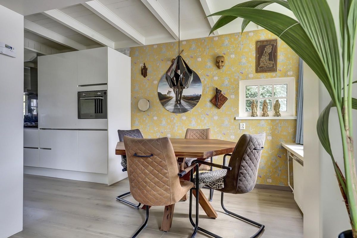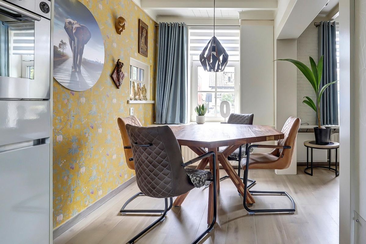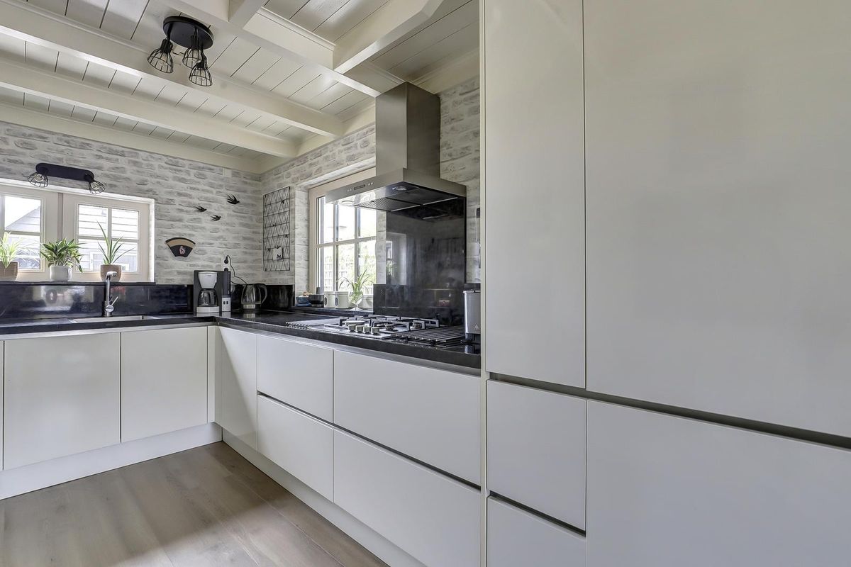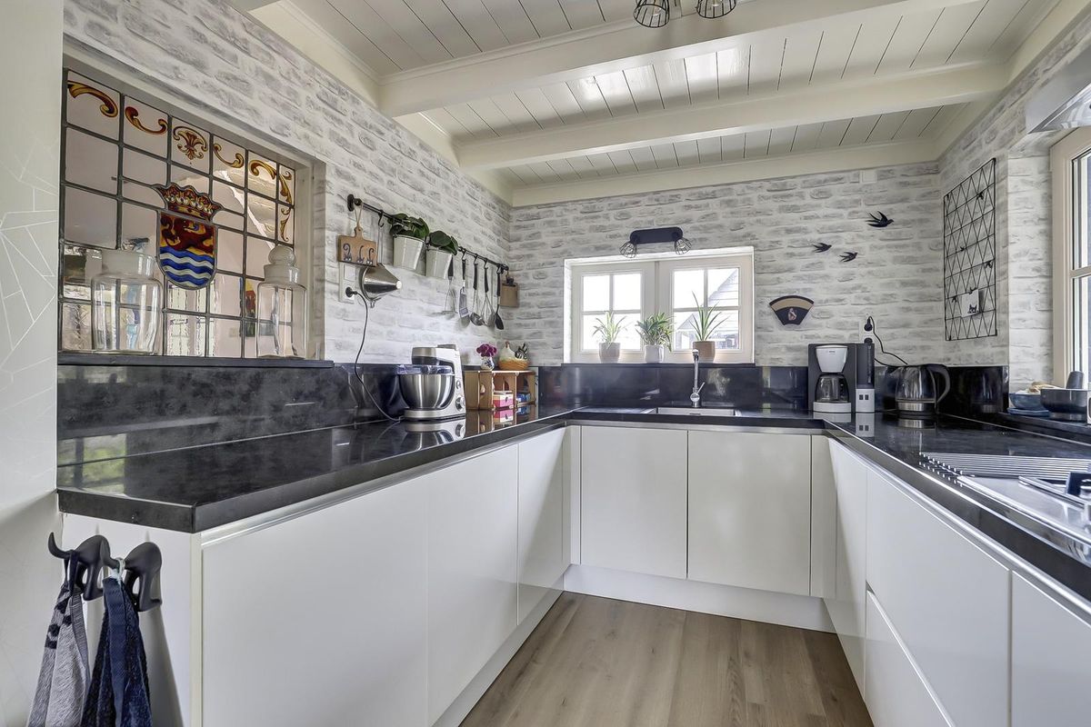 De woonkamer loopt vloeiend over in de eetkamer, waar voldoende ruimte is voor een royale eettafel om gezellig te tafelen of samenzijn met familie en vrienden. De open verbinding met de keuken zorgt voor een fijne, ruimtelijke beleving. De keuken is modern uitgevoerd (u-opstelling) in wit met zwarte accenten, voorzien van een ruim composiet werkblad en diverse inbouwapparatuur, waaronder een combimagnetron, gasfornuis, afzuigkap, koelkast en vaatwasser. Vanuit de keuken kijkt u via het Zeeuwse glas-in-lood-raam naar de woonkamer en via de ramen heeft u een prachtig zicht op de achtertuin, een heerlijke plek om de dag te beginnen met een kop koffie.