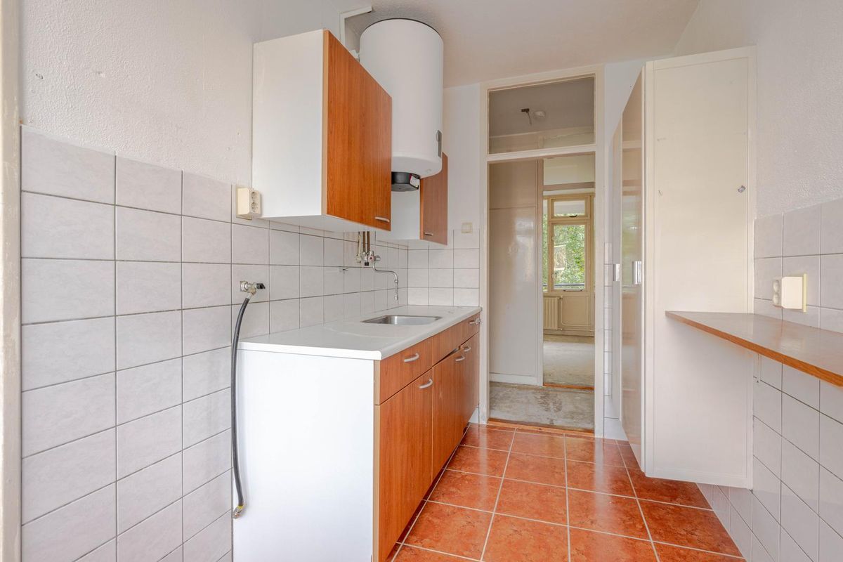* Keukenruimte voorzien van tegelvloer, betegelde achterwand, functionele keukenopstelling, boiler en een deur naar de badkamer.