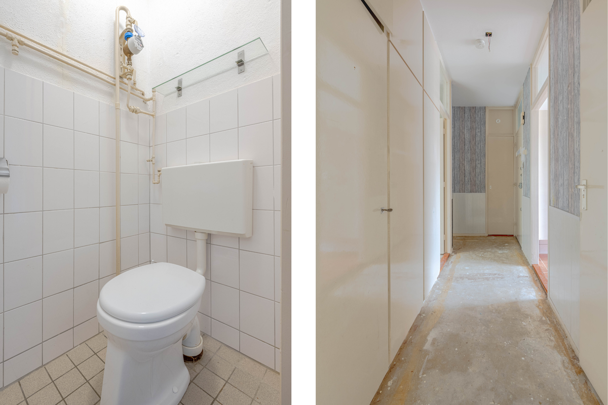 * Toiletruimte voorzien van duoblok-toiletopstelling en gedeeltelijk lichte betegeling.