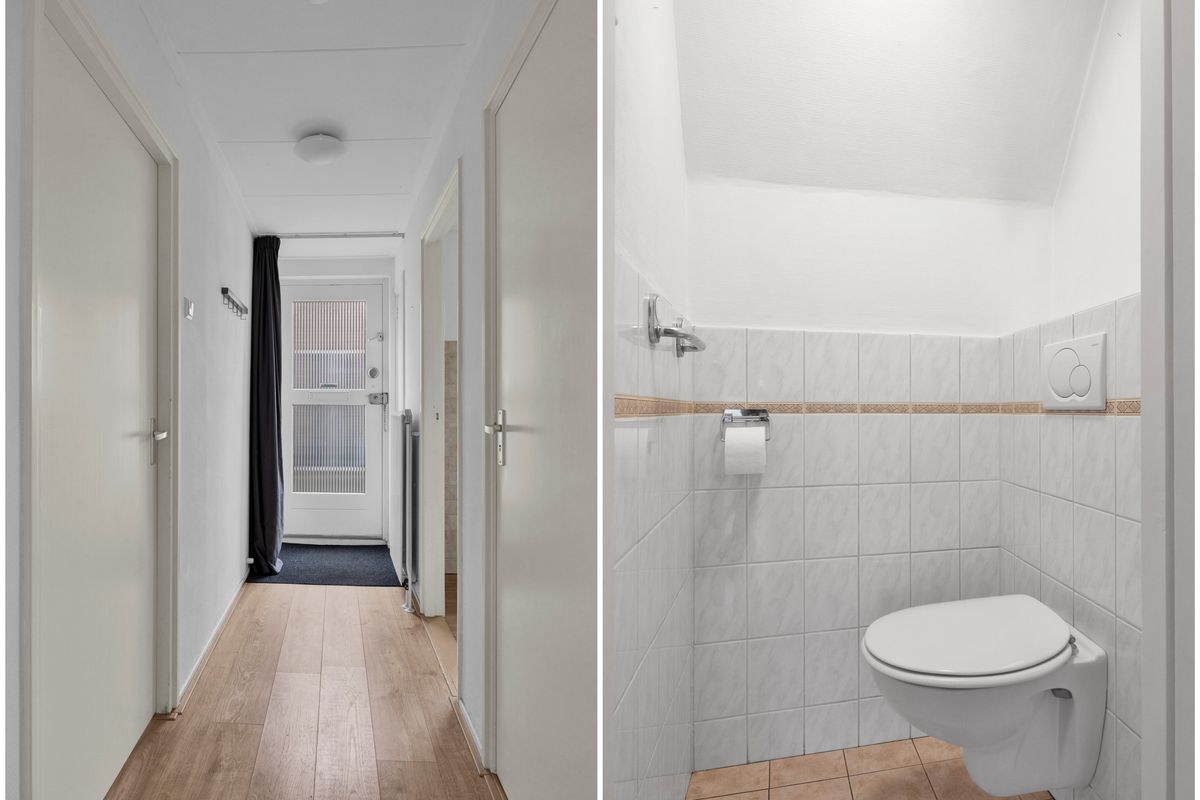 We betreden de woning via de voordeur en komen in de hal met meterkast en toegang tot het toilet en de slaapkamer met wastafel. Rechts van de hal bevindt zich de woonkamer, een knusse en sfeervolle leefruimte met enkele inbouwkasten. Links van de hal bevindt zich de keuken, deze heeft een hoekkeukenopstelling welke is voorzien van diverse inbouwapparatuur zoals; koelkast, gaskookplaat, afzuigkap en vaatwasser. Via de keuken is ook de trapopgang toegankelijk. Achter de keuken bevindt zich de bijkeuken met cv-installatie en aansluiting voor de wasmachine en droger, tevens toegang tot de achtertuin. Via de bijkeuken kom je in de badkamer met 2e toilet, douche en wastafelmeubel.