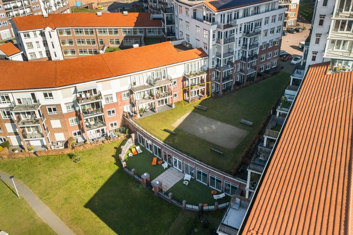 Het appartement is gelegen aan de binnentuin, een sfeervolle binnenruimte die perfect dient als ontmoetingsplek voor de bewoners. Aan de andere zijde van de woning bevindt zich een zonnig terras op het zuiden, dat uitkijkt op een jeu de boules baan, waardoor u kunt genieten van gezelligheid en sociale interactie op de baan.