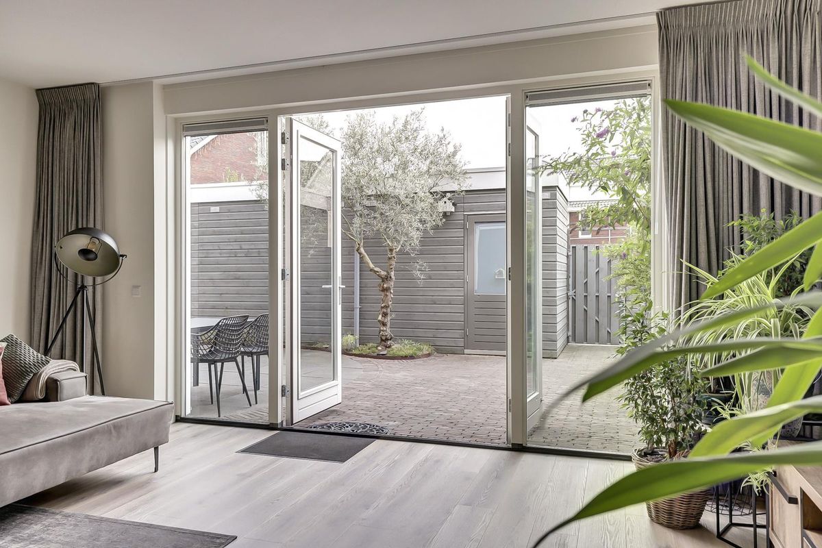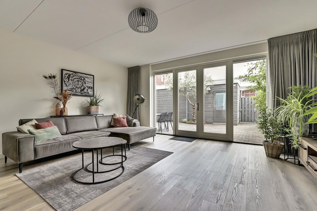 Vanuit de hal loop je door naar de keuken of de woonkamer. Deze tuingerichte woonkamer is heerlijk licht, biedt volop ruimte voor een gezellige zithoek en via de openslaande deuren stap je zo de zonnige tuin in – een ideale plek om te ontspannen of gezellig buiten te eten.