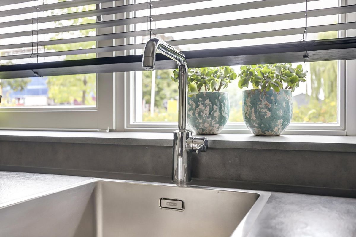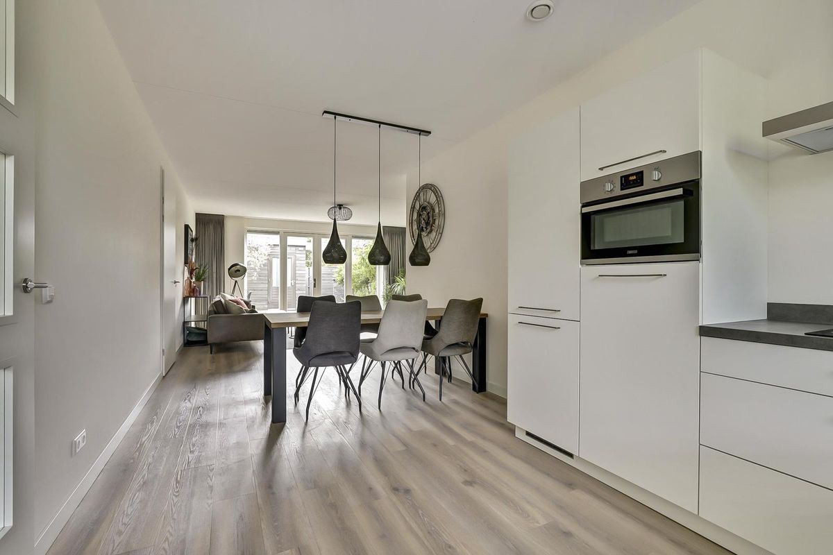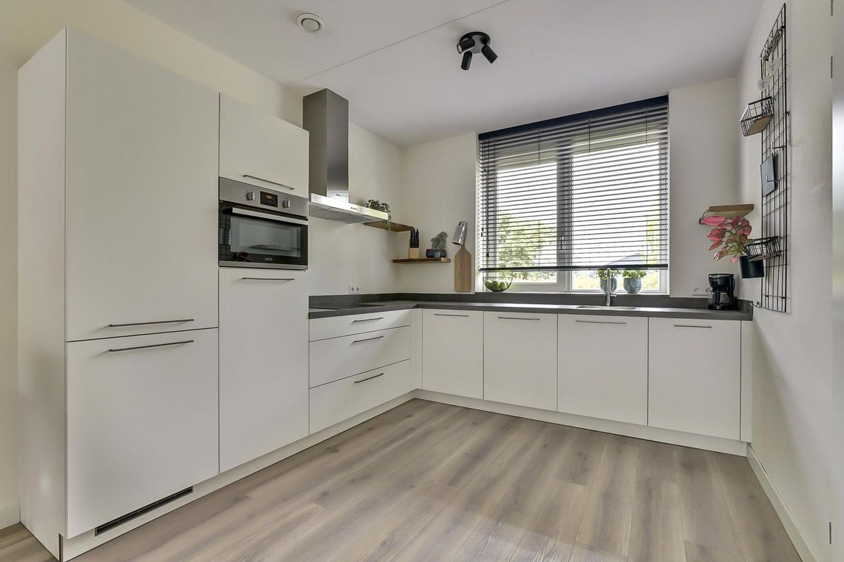 De open woonkeuken is ruim en modern uitgevoerd, heeft ruimte voor een eethoek en is voorzien van alle inbouwapparatuur, waaronder een koel-vriescombinatie, combimagnetron, vaatwasser, inductiekookplaat en afzuigkap.