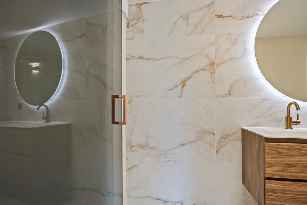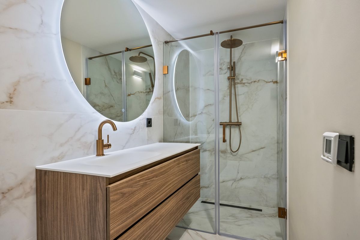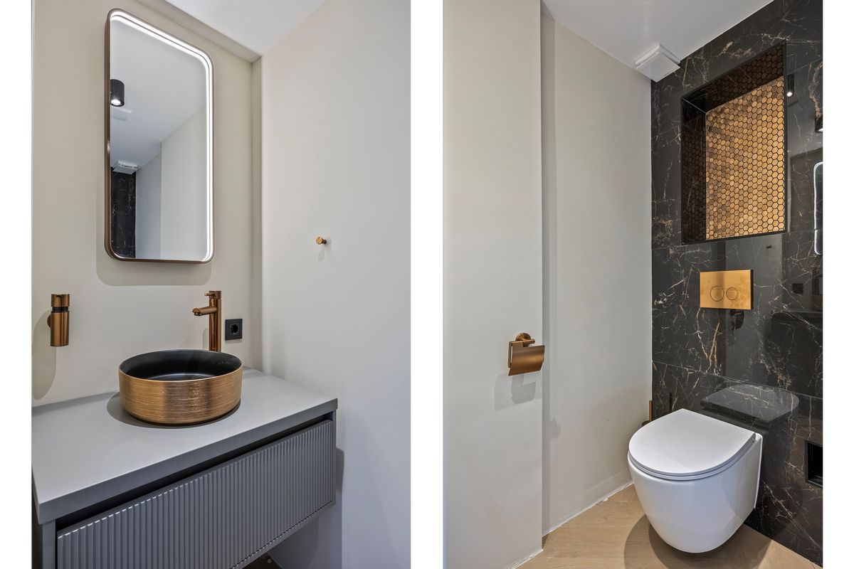 A staircase from the living room leads to the upper floor, where you’ll find three generously sized bedrooms — perfect as master bedrooms or home offices. The luxurious bathroom exudes a spa-like atmosphere, with beautiful tiling, a spacious (rain) shower, double vanity with cabinet, brass fixtures, and the second toilet.