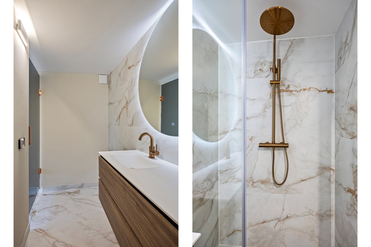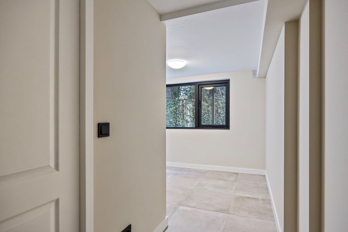 The brand-new kitchen is a true eye-catcher. Featuring an elegant marble countertop, double oven, cooktop with integrated extractor, brass faucet, refrigerator, freezer, and dishwasher — it’s a dream for any cooking enthusiast. Adjacent to the kitchen is a stylish master bedroom with an en suite bathroom, equipped with a walk-in shower and a double vanity with mirror. This floor also includes a spacious and luxurious toilet and a large laundry room at the rear, with washing machine connection and extra storage space.