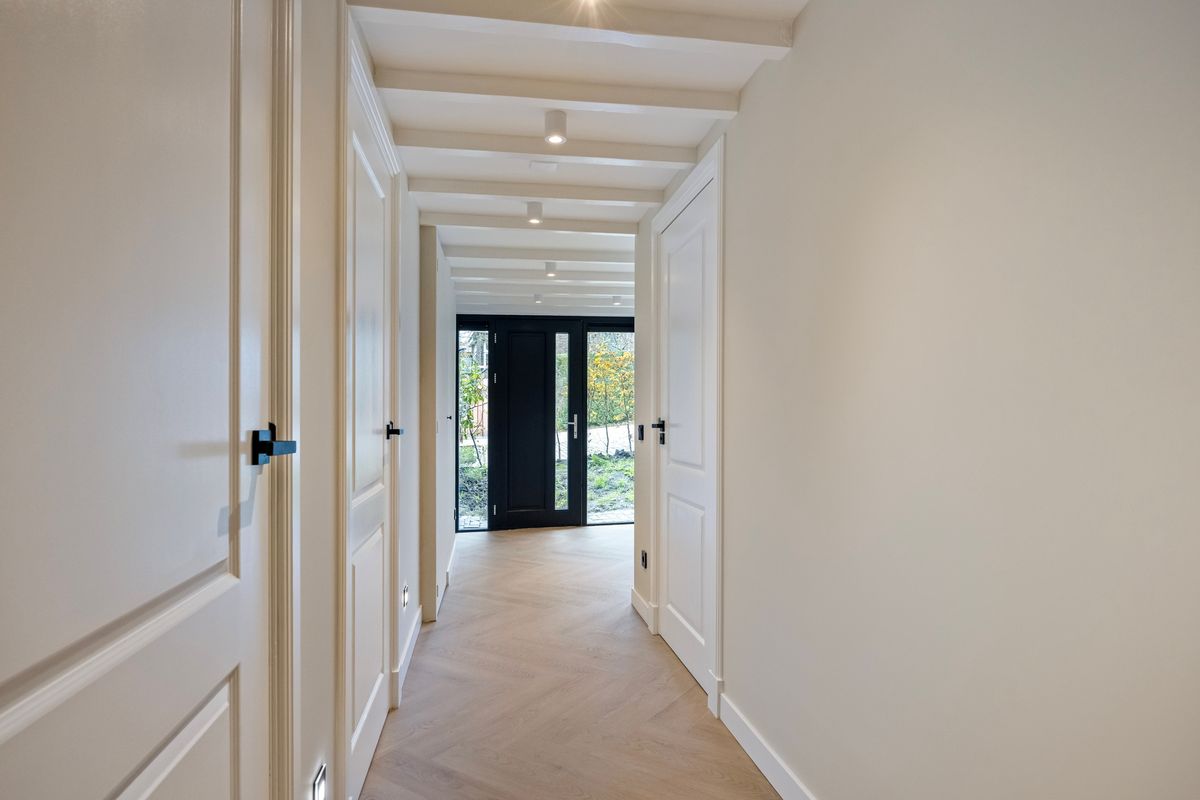 A staircase from the living room leads to the upper floor, where you’ll find three generously sized bedrooms, perfect as master bedrooms or home offices. The luxurious bathroom exudes a spa-like atmosphere, with beautiful tiling, a spacious (rain) shower, double vanity with cabinet, brass fixtures, and the second toilet.