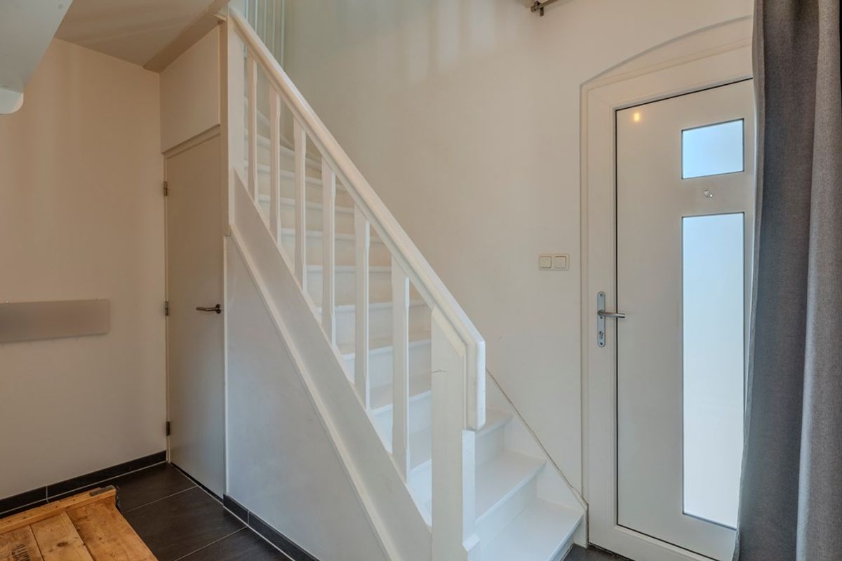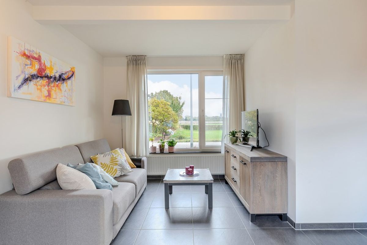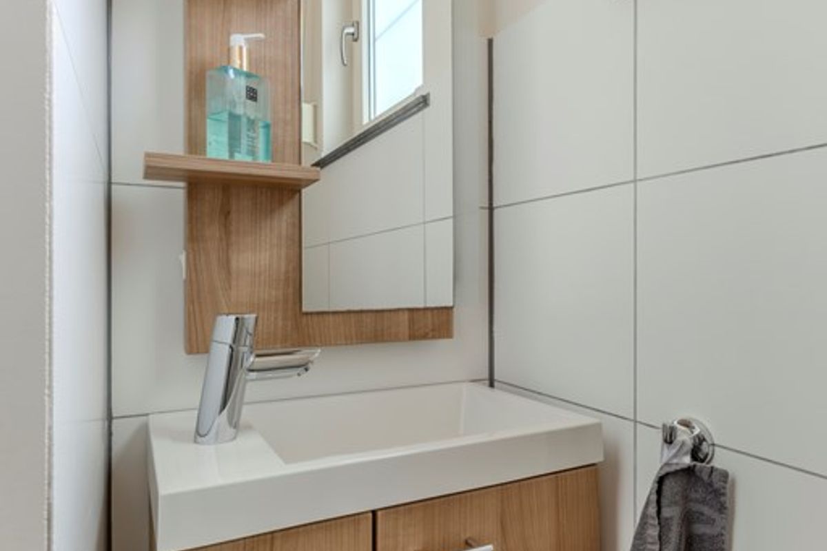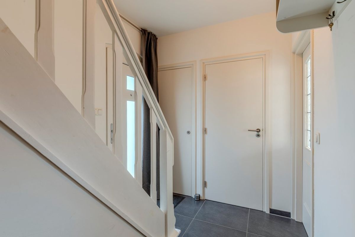 Ruime hal (10 m²) met moderne tegelvloer, zwevend toilet met fonteintje, woonkamer met tegelvloer en schuifpui naar het terras (32 m²), half open keuken (12 m²) met een keukenopstelling v.v. een 5-pits gaskookplaat, afzuigkap, oven/stoomoven, warmhoud lade en vaatwasser, een bijkeuken (8 m²) en de extra badkamer (3 m²) met ligbad en aansluitingen voor het witgoed. De inpandige garage (26 m²) met toegang tot een zolderberging (12 m²) maakt het geheel af.
