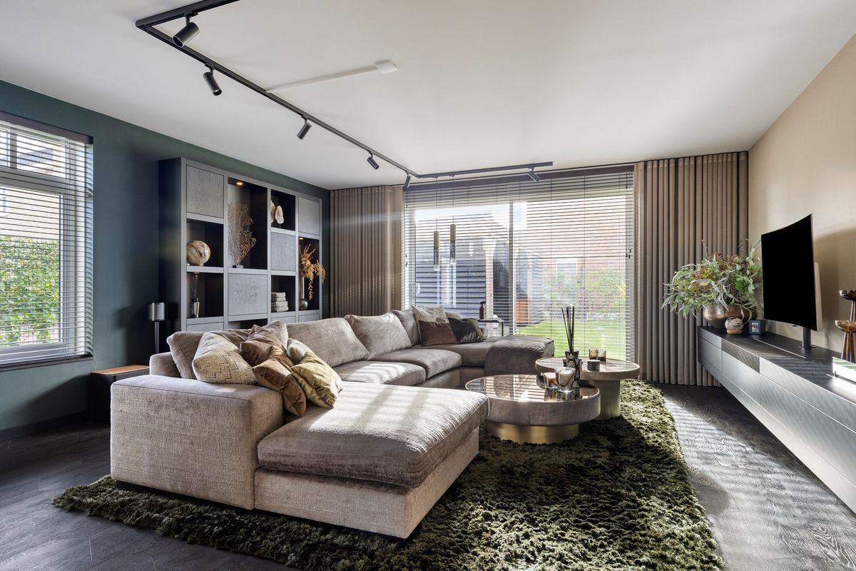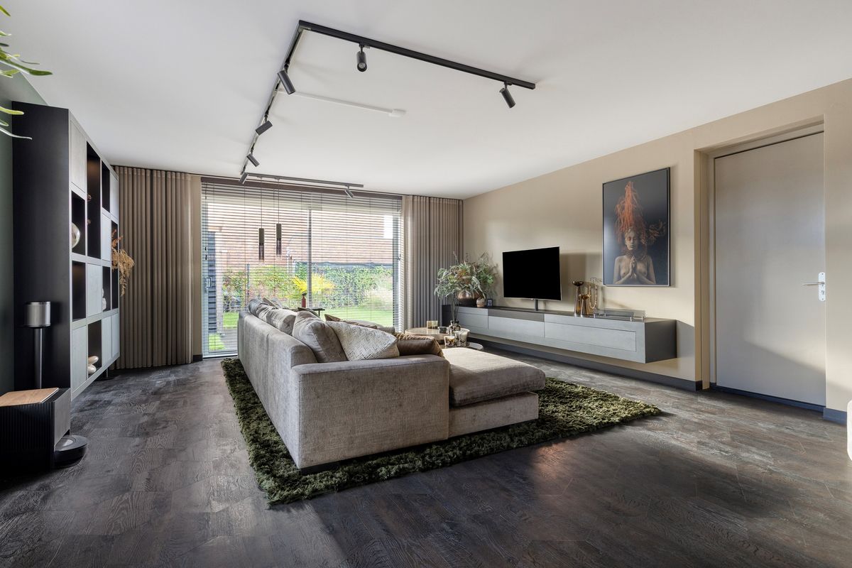 Aan de achterzijde van de woning bevindt zich de sfeervolle woonkamer. Grote ramen en een aluminium schuifpui zorgen voor een overvloed aan licht en een directe verbinding met de tuin. De ruimte ademt rust en luxe, met vloerverwarming, fraai afgewerkte wanden, houten jaloezieën en een sfeervolle afwerking. Via een binnendeur heeft u bovendien toegang tot de inpandige garage. De woonkamer staat in open verbinding met de woonkeuken, wat zorgt voor een heerlijk gevoel van ruimte en samenhang.