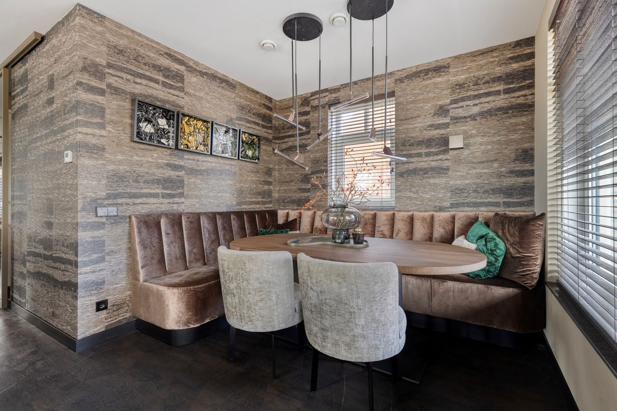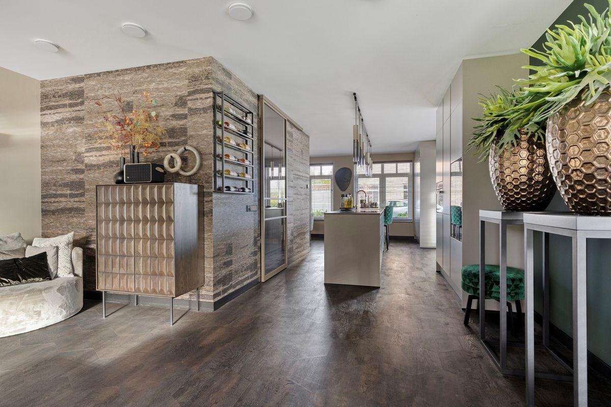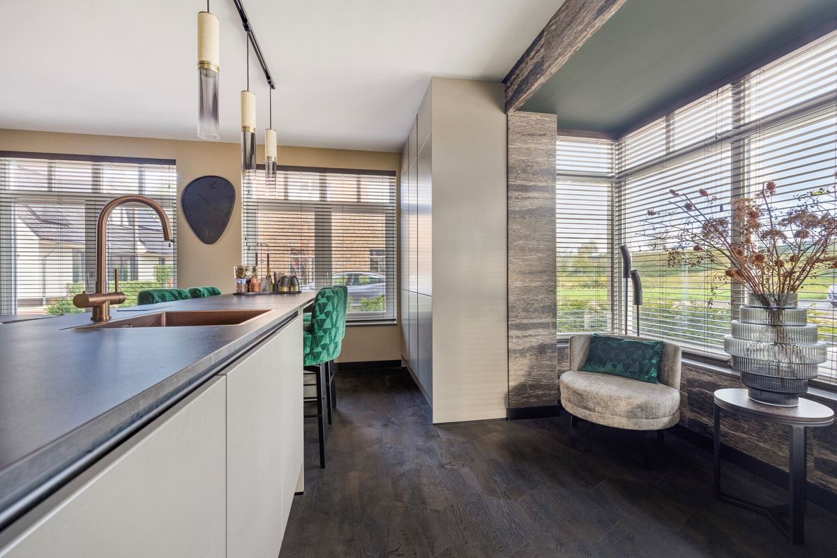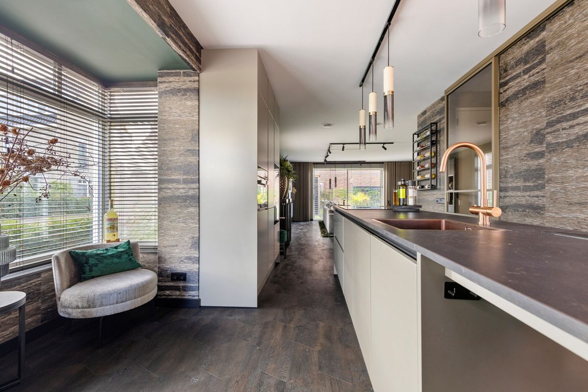 De woonkeuken is een echte blikvanger – een droom voor elke kookliefhebber met hoge kastenwand en het 4,5 meter lange kookeiland, voorzien van hoogwaardige apparatuur: een Bora inductiekookplaat met geïntegreerde afzuiging, een grote koelkast, grote vriezer met 9 laden, vaatwasser, combi-oven/magnetron, wijnkoelkast met twee zones en een Selsiuz kokend waterkraan. Dankzij de ruime eetbar, de riante zithoek en een erker is dit niet alleen een plek om te koken, maar ook om te genieten, te borrelen en samen te zijn.