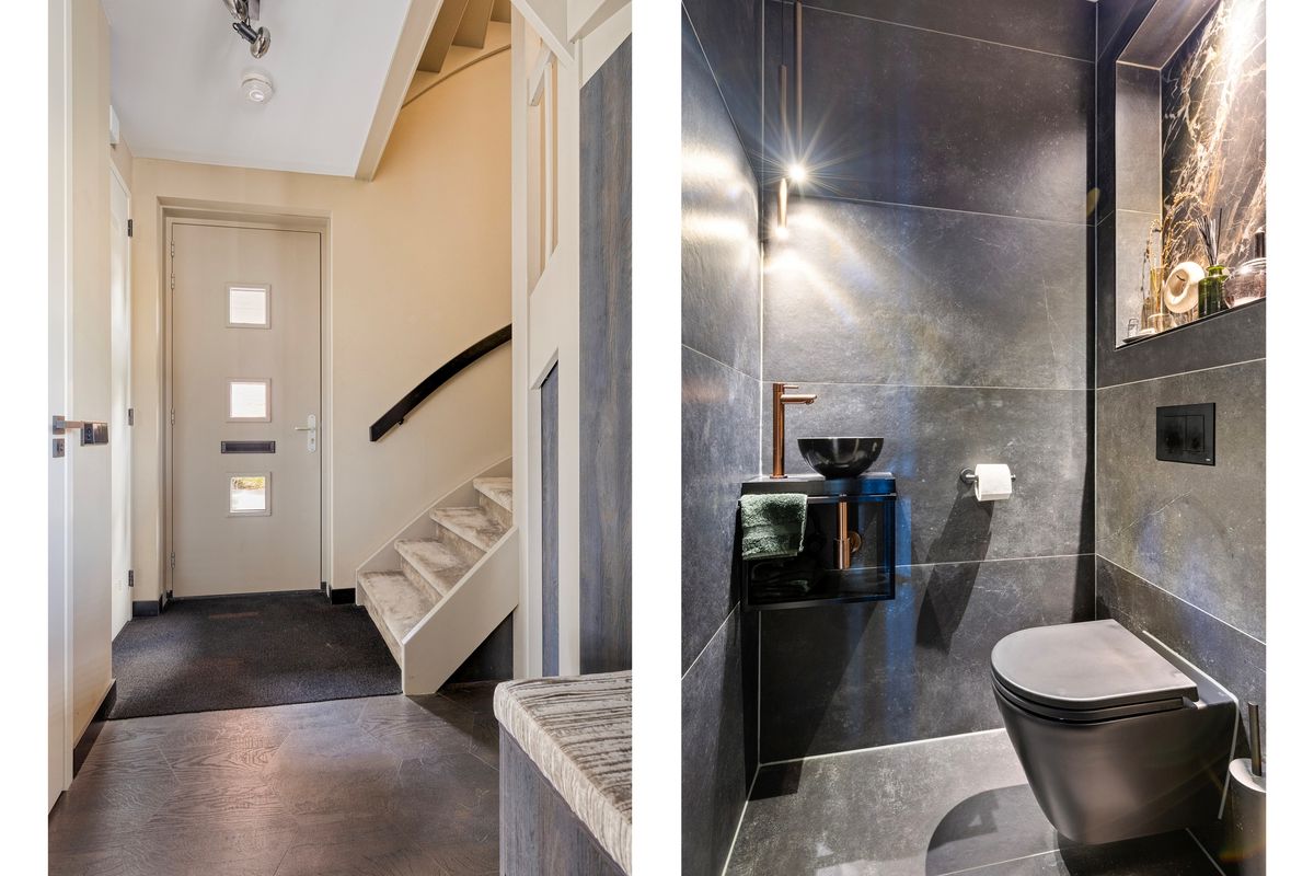 Het toilet op de begane grond is een toonbeeld van luxe. Volledig betegeld met designtegels en voorzien van een zwevend toilet en fontein, straalt deze ruimte stijl en klasse uit – tot in de kleinste details.