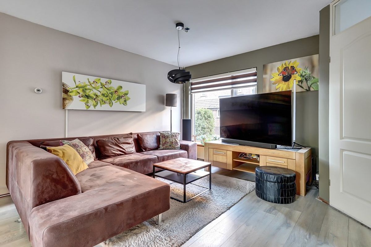 Langs het toilet kom je binnen in de woonkamer. Meteen valt op dat hier lekker veel licht de woning binnen komt, dat wordt versterkt door de lichte kleurstellingen en het glad gestuukte plafond. De schuifpui zorgt voor mooie zichtlijnen over de tuin.