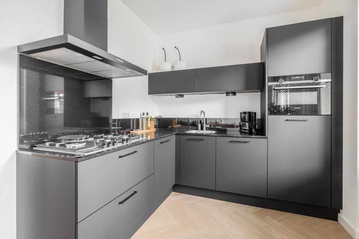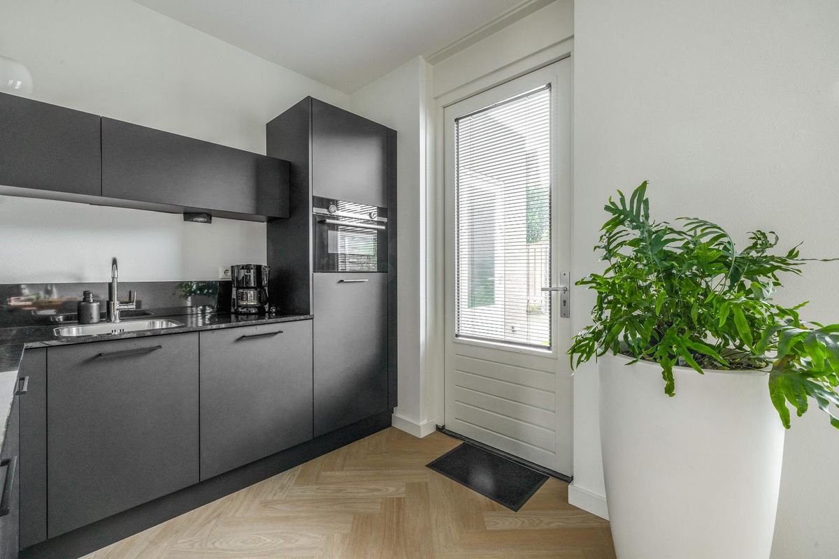 De L-vormige woonkamer met open keuken is voorzien van een mooie visgraat pvc-vloer met vloerverwarwming. De openslaande deuren en aparte loopdeur bieden direct toegang tot de achtertuin.