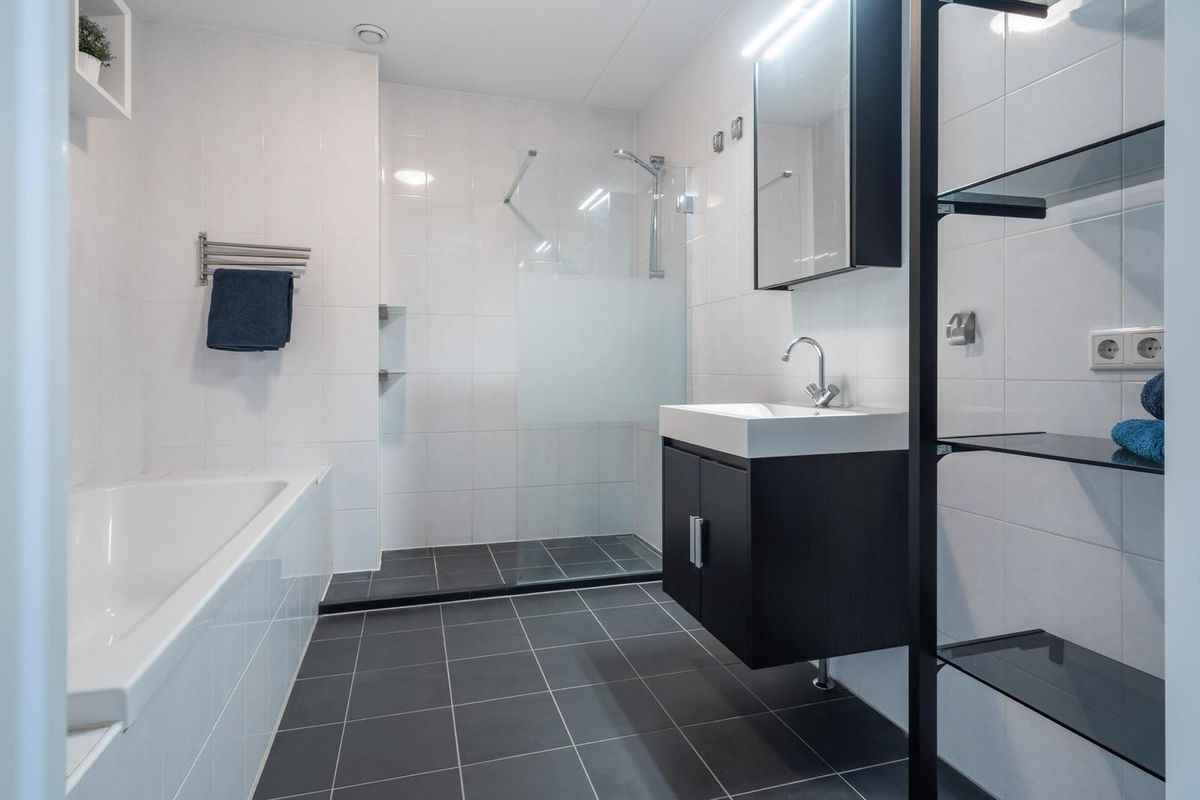 Aan de andere zijde van het appartement zijn twee slaapkamers gesitueerd. De grootste slaapkamer heeft toegang tot het balkon aan de achterzijde. De tweede slaapkamer heeft eveneens een goed formaat. De badkamer is luxe vormgegeven met volledig betegelde wanden, inloopdouche, ligbad, handdoekradiator en een wastafel met meubel.