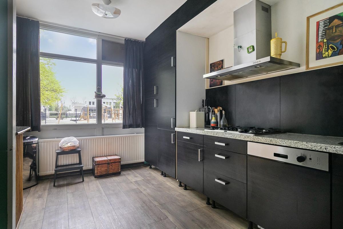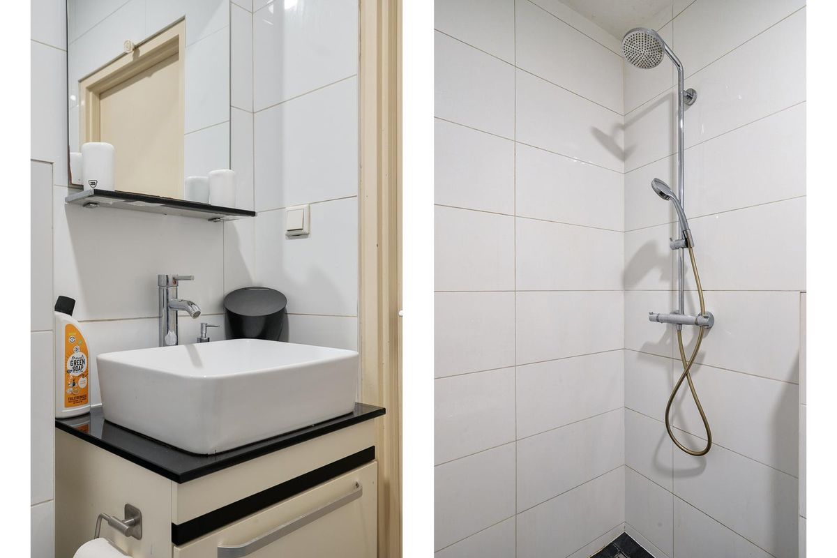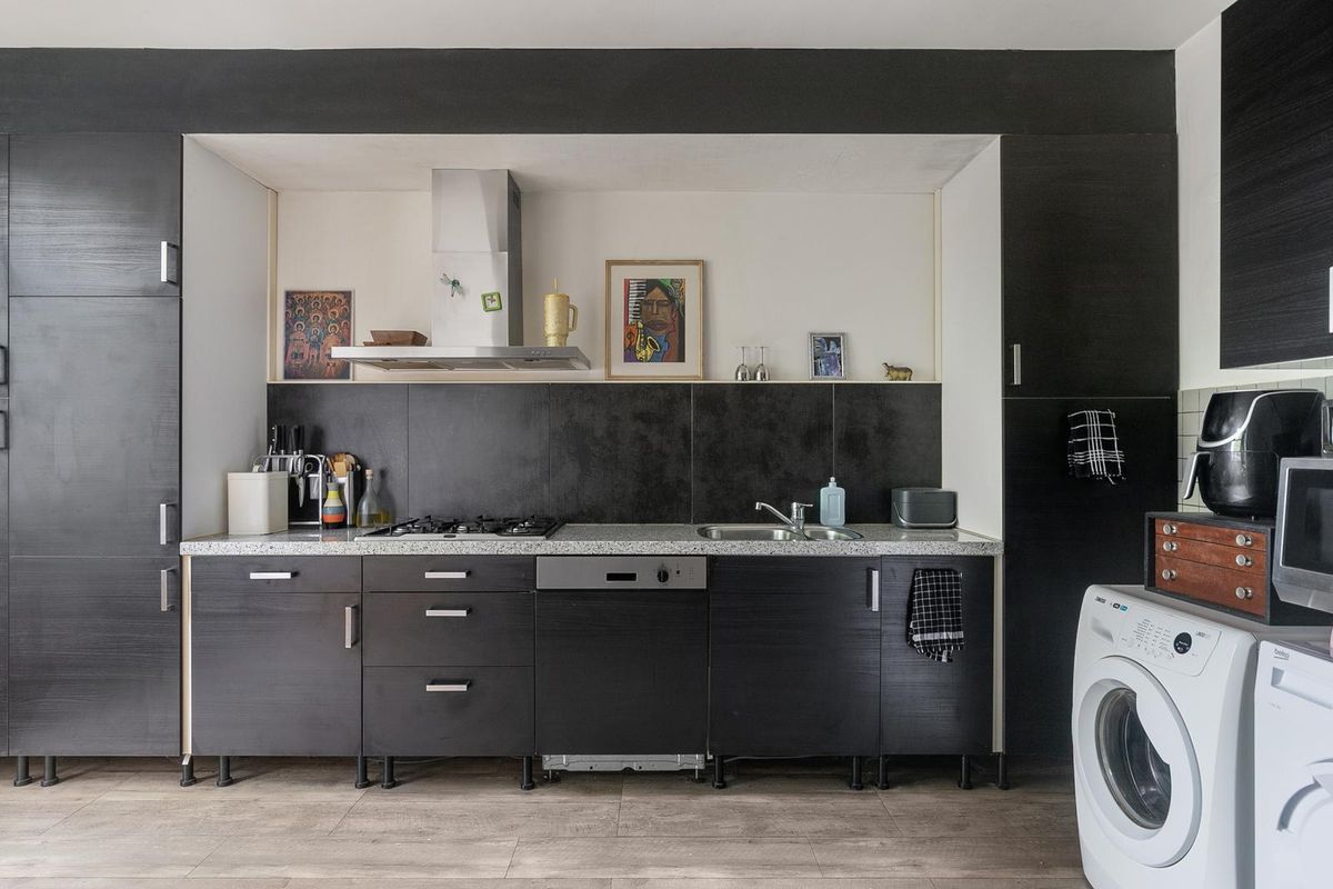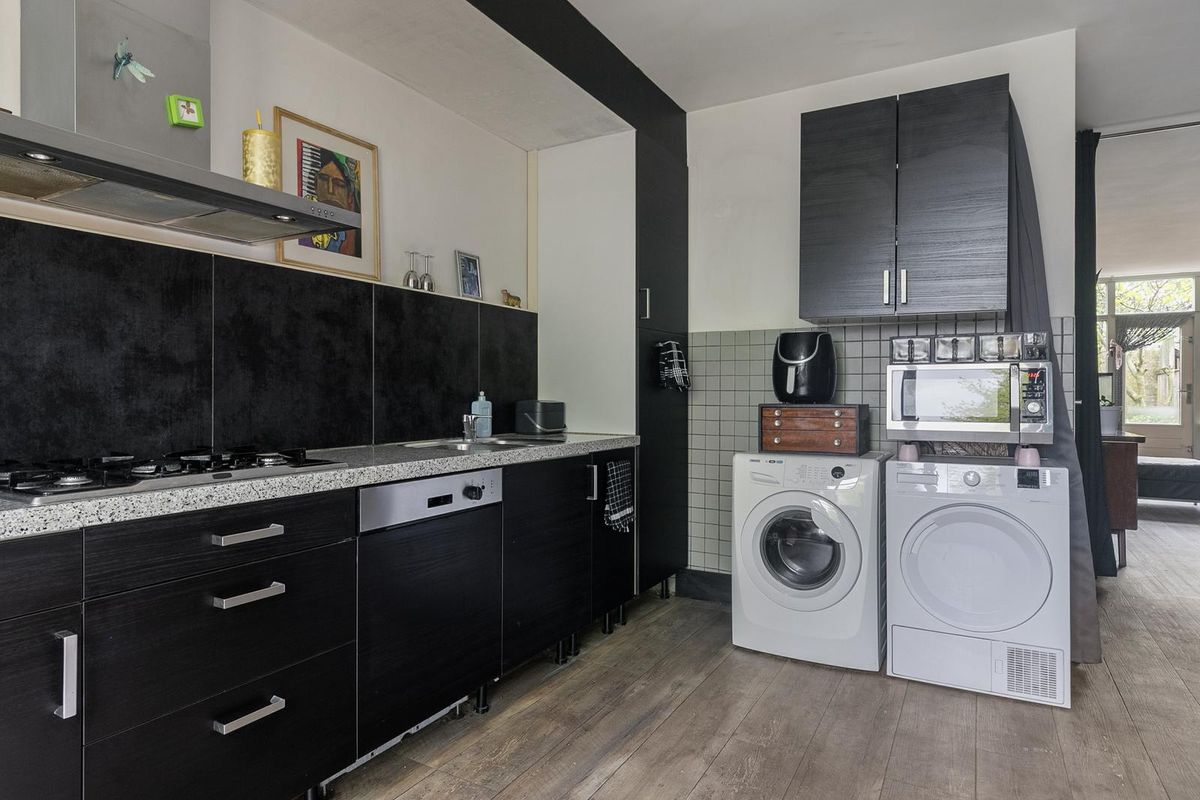 Je komt binnen via de entree, waar voldoende plek is voor een garderobe en de meterkast is gesitueerd. Vanuit hier loop je door naar de halfopen keuken aan de voorzijde van de woning. Deze keuken is ingericht met een modern keukenmeubel en apparatuur, waaronder een gaskookplaat, afzuigkap, koelkast en de aansluitingen voor witgoed. Vanuit de keuken kijk je door naar de woonkamer: een royale leefruimte van ruim 6 meter diep met volop licht dankzij de grote achterpui. Hier is genoeg plek voor een sfeervolle zithoek én een ruime eettafel. De achterdeur geeft toegang tot het terras en de tuin. Tussen de keuken en woonkamer bevindt zich een tussenhalletje met toegang tot het toilet.