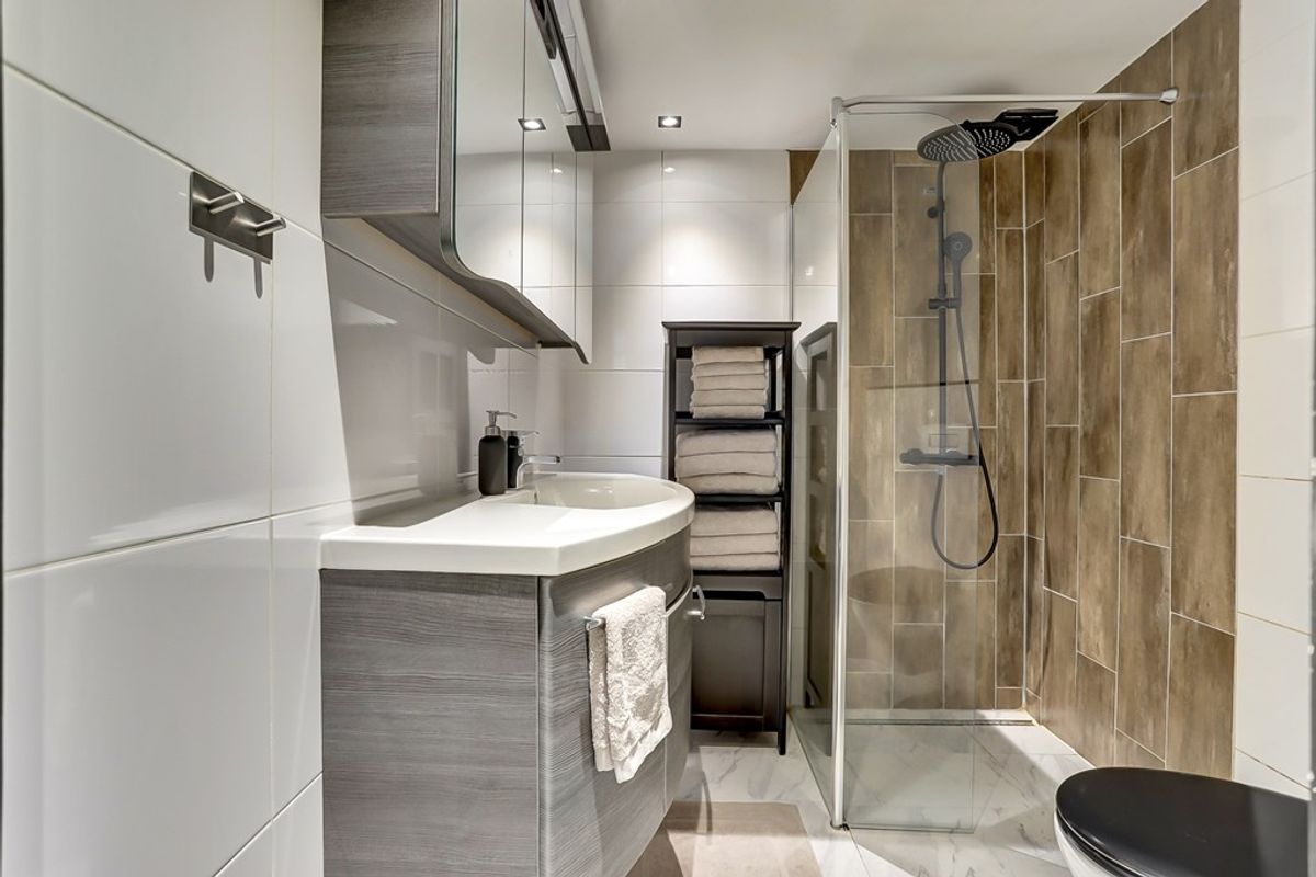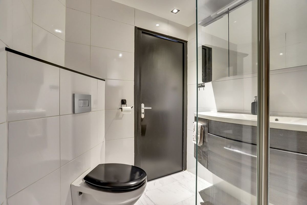 De badkamer bevindt zich eveneens op de begane grond en is modern uitgevoerd met mechanische ventilatie, een inloopdouche, hangend toilet en wastafelmeubel.