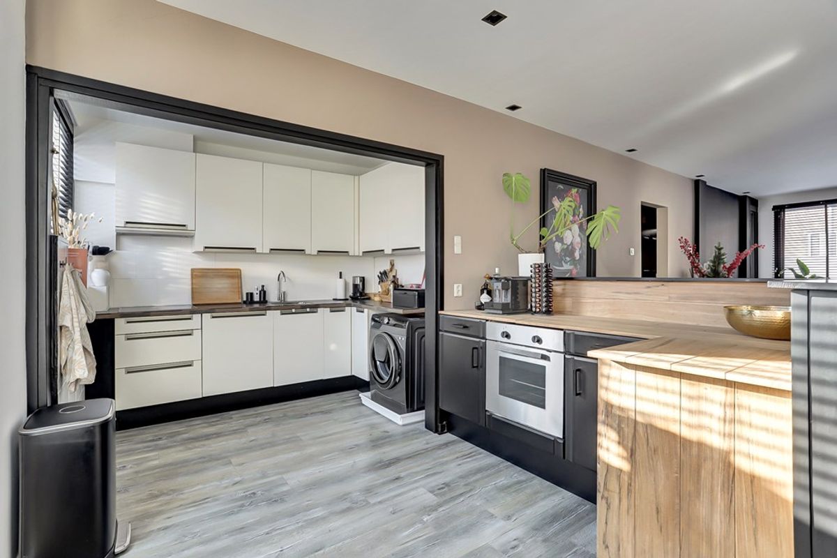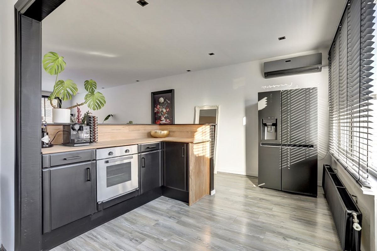 De open keuken sluit praktisch aan op de woonkamer en is voorzien van diverse inbouwapparatuur, waaronder een inductiekookplaat, oven, afzuigkap en vaatwasser. Vanuit de keuken is er toegang tot het balkon, een fijne plek voor een moment buiten.