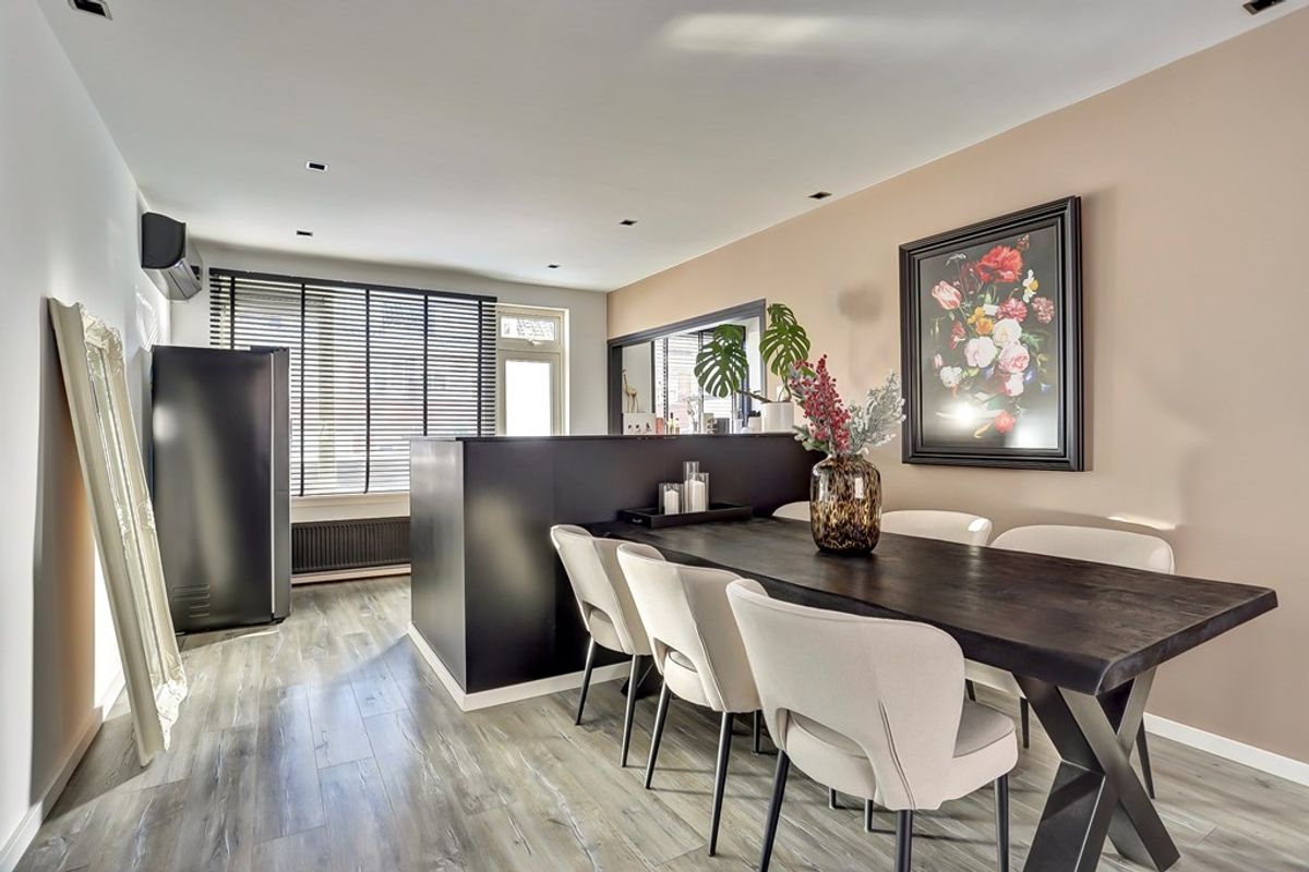 Via de eigen entree bereikt u de hal met vaste trap naar het souterrain. De lichte woonkamer is strak afgewerkt met gestucte wanden en plafonds en een moderne laminaatvloer. Grote raampartijen zorgen voor een aangename lichtinval en een prettige verbinding met buiten. Voldoende zitruimte in de eethoek aan een royale eettafel.