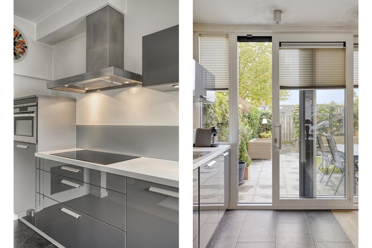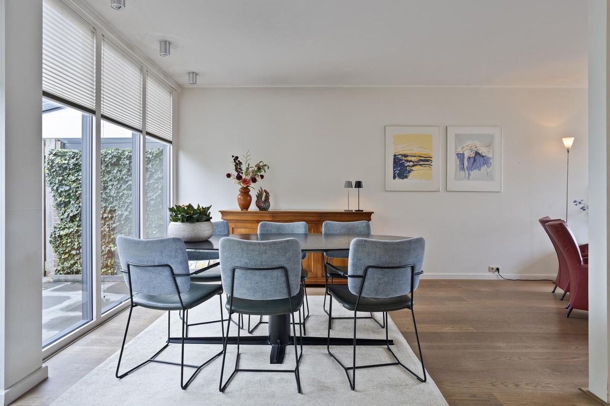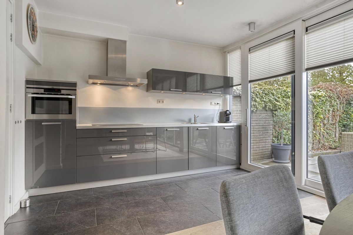 Bij binnenkomst valt de ruime woonkamer op, waar de aluminium pui met schuifpui en grote ramen zorgt voor veel natuurlijk licht en een mooi uitzicht op de zonnige achtertuin. De open keuken vormt een naadloze verbinding met de woonkamer en is voorzien van een modern keukenblok met AEG-inbouwapparatuur. De combinatie van een eikenhouten vloer en een tegelvloer met vloerverwarming zorgt voor een warme en stijlvolle uitstraling. De wanden en plafonds zijn strak gestuukt en de toiletruimte op de begane grond is modern uitgevoerd.