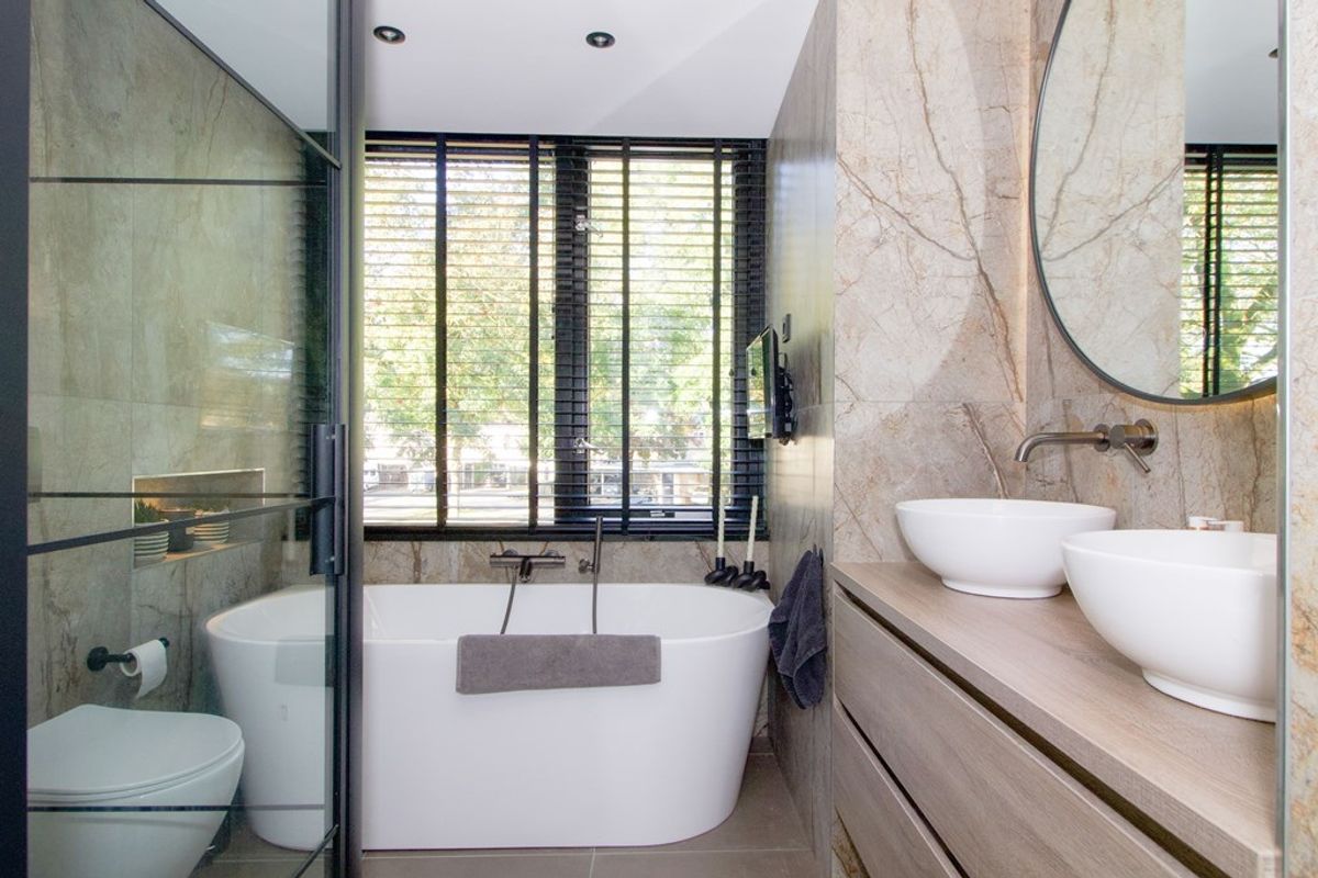 De badkamer is centraal gelegen en voorzien van een moderne inrichting met een wastafelmeubel, toilet, douche en ligbad.