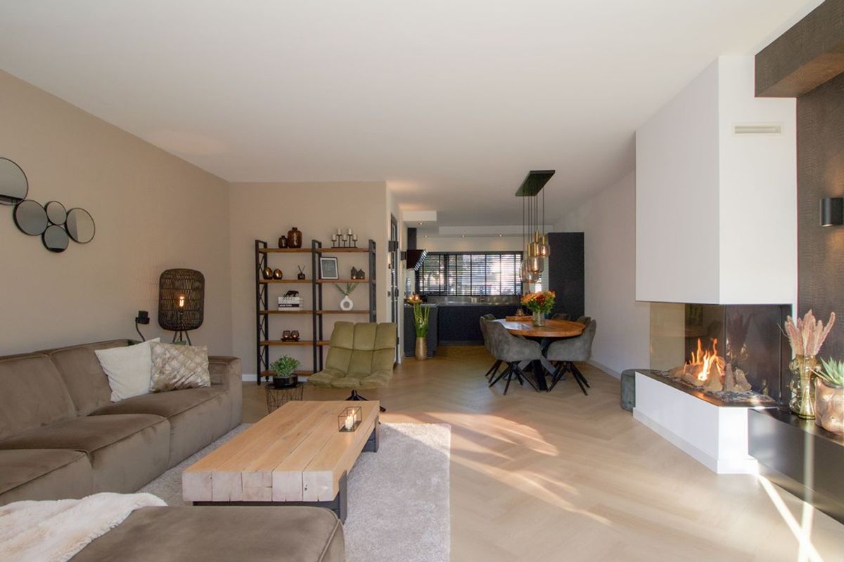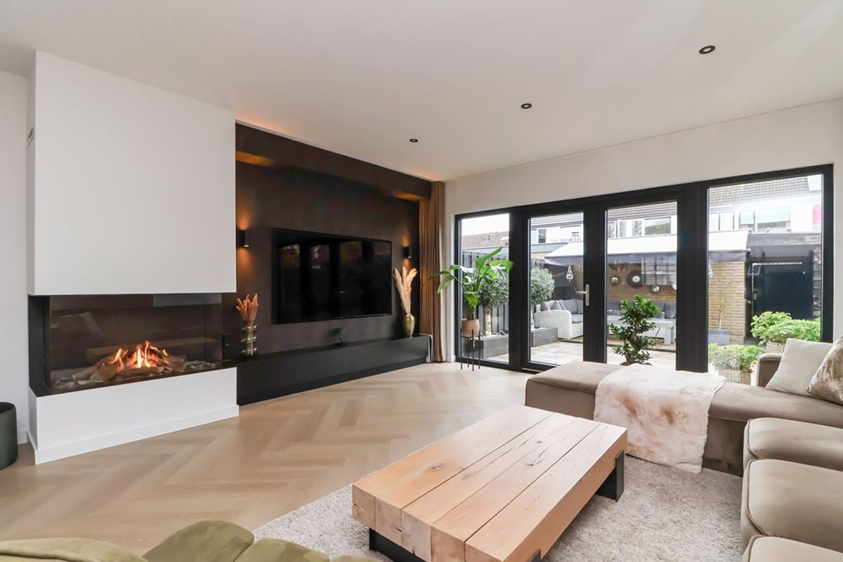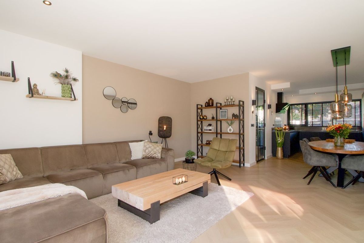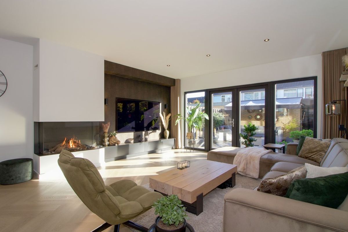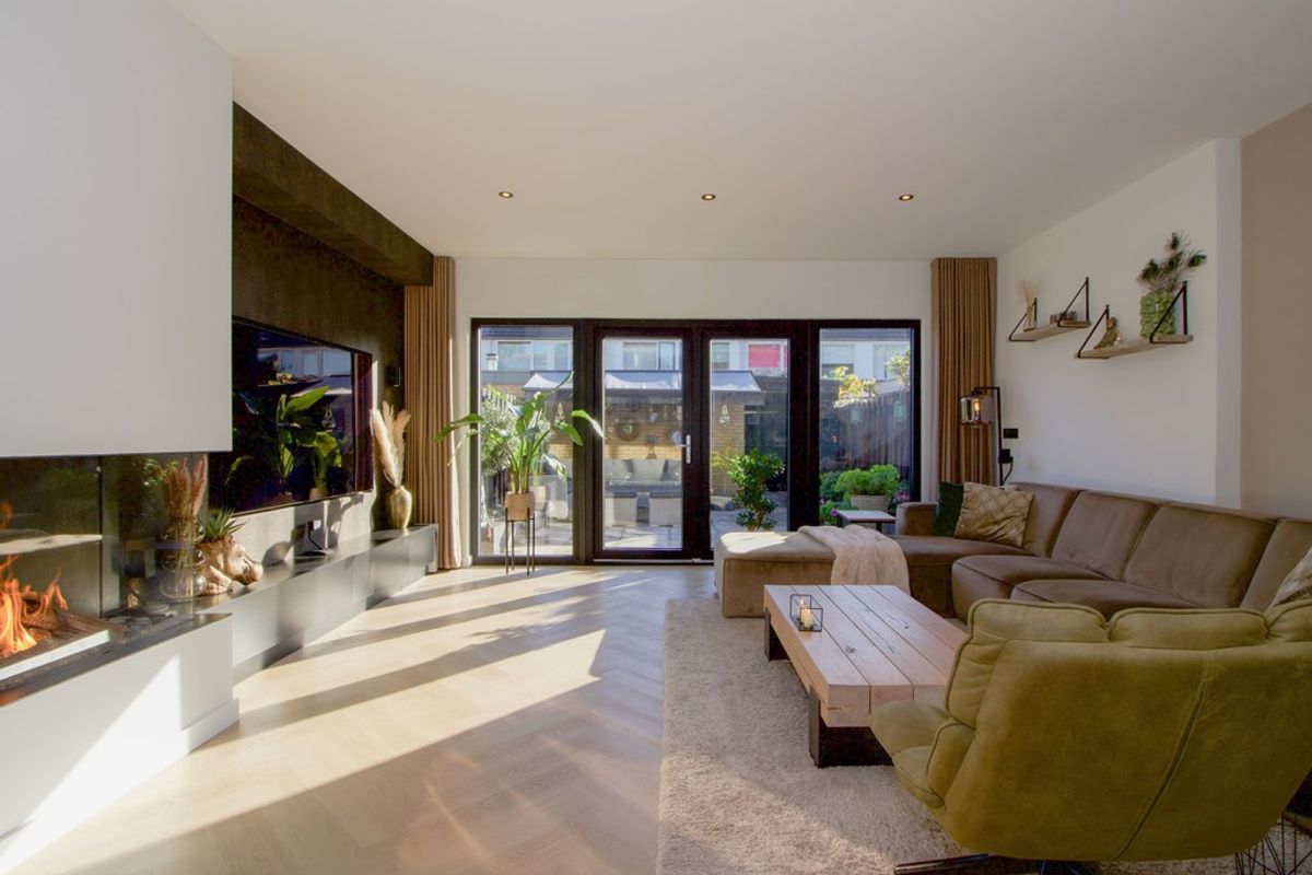 Aan de achterzijde van de woning bevindt zich de ruime woonkamer. De open indeling zorgt voor een aangename verbinding tussen koken, eten en wonen. De woonkamer biedt volop ruimte voor een comfortabele zithoek en heeft dubbele openslaande deuren naar de tuin, waardoor binnen en buiten mooi in elkaar overlopen.