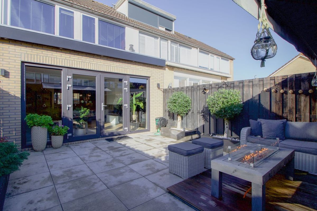 De tuin is sfeervol ingericht met strakke plantenbakken, sierlijke beplanting en een vaste zithoek voorzien van een gashaardtafel en zonwering. Hierdoor is het ook op koelere avonden heerlijk vertoeven.