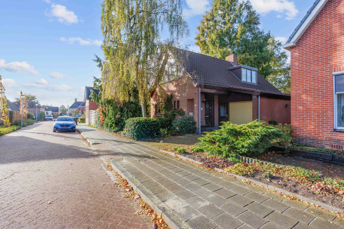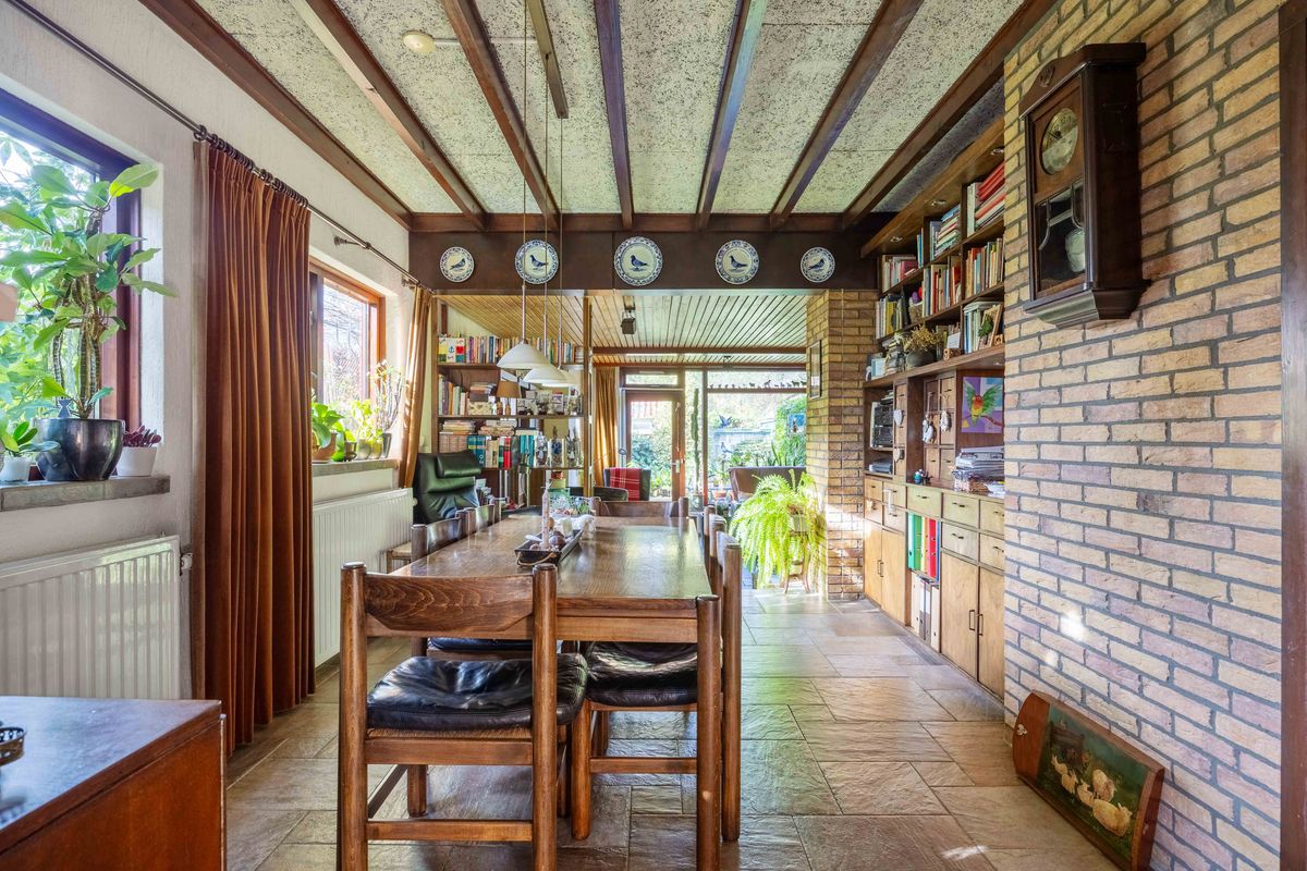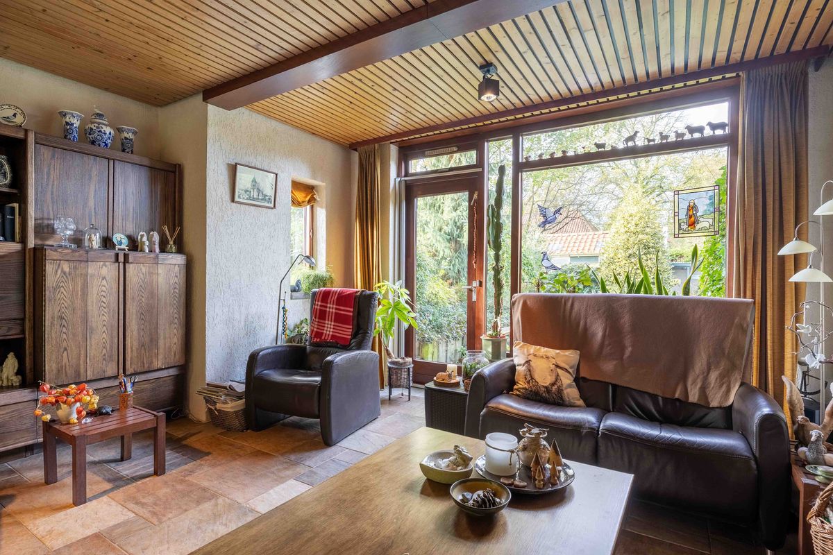 Achter de woning een mooie tuin met borders, veel groen, terras, vijver en hobbyruimtes.