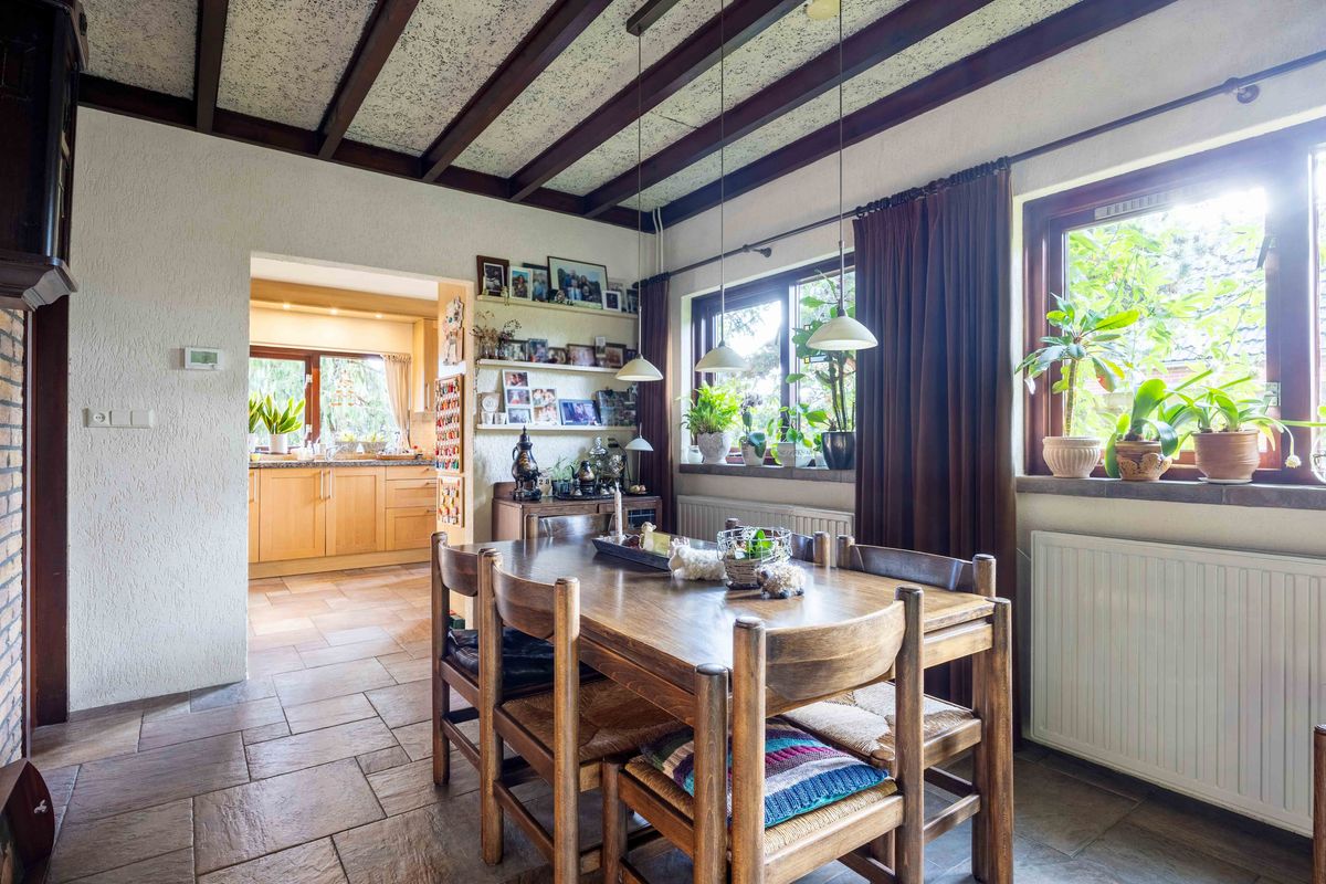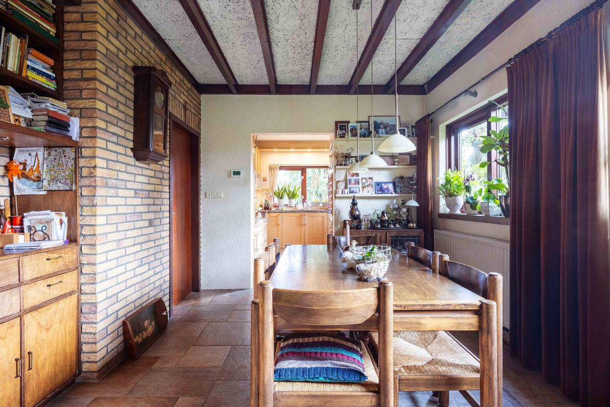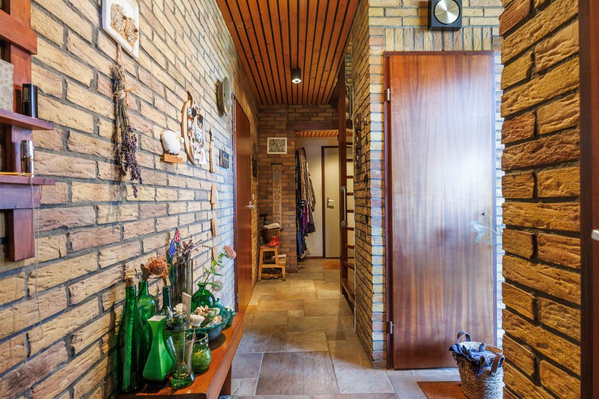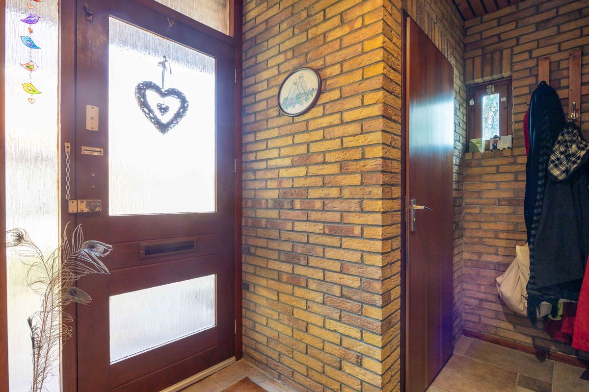 Achter de woning een mooie tuin met borders, veel groen, terras, vijver en hobbyruimtes.