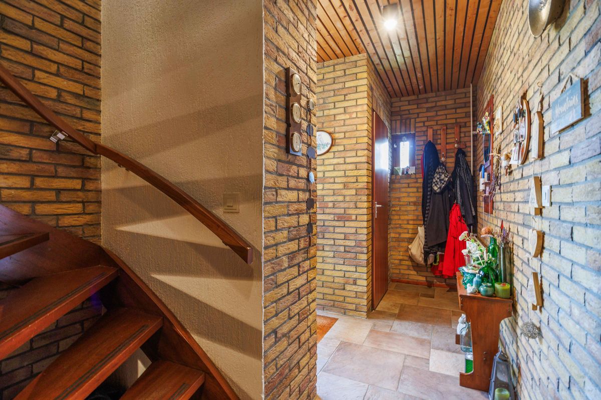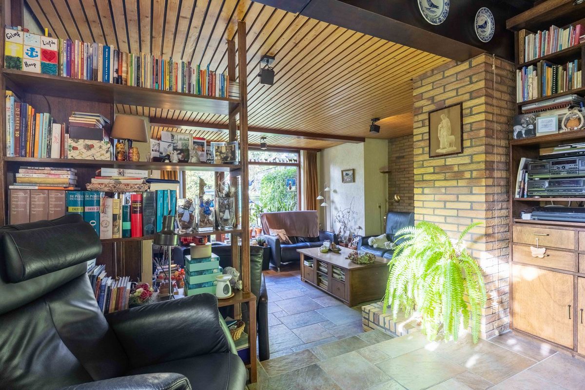 Achter de woning is een mooie, groene verdiepte tuin met een vijver en terrassen en een tuinschuur.