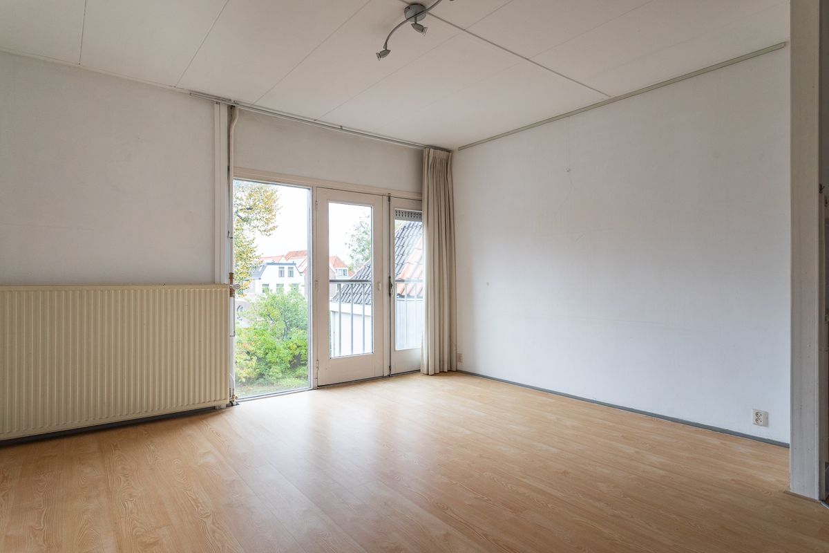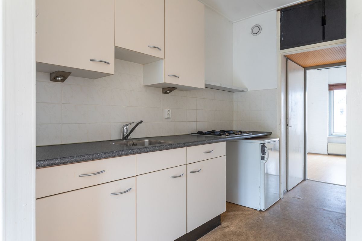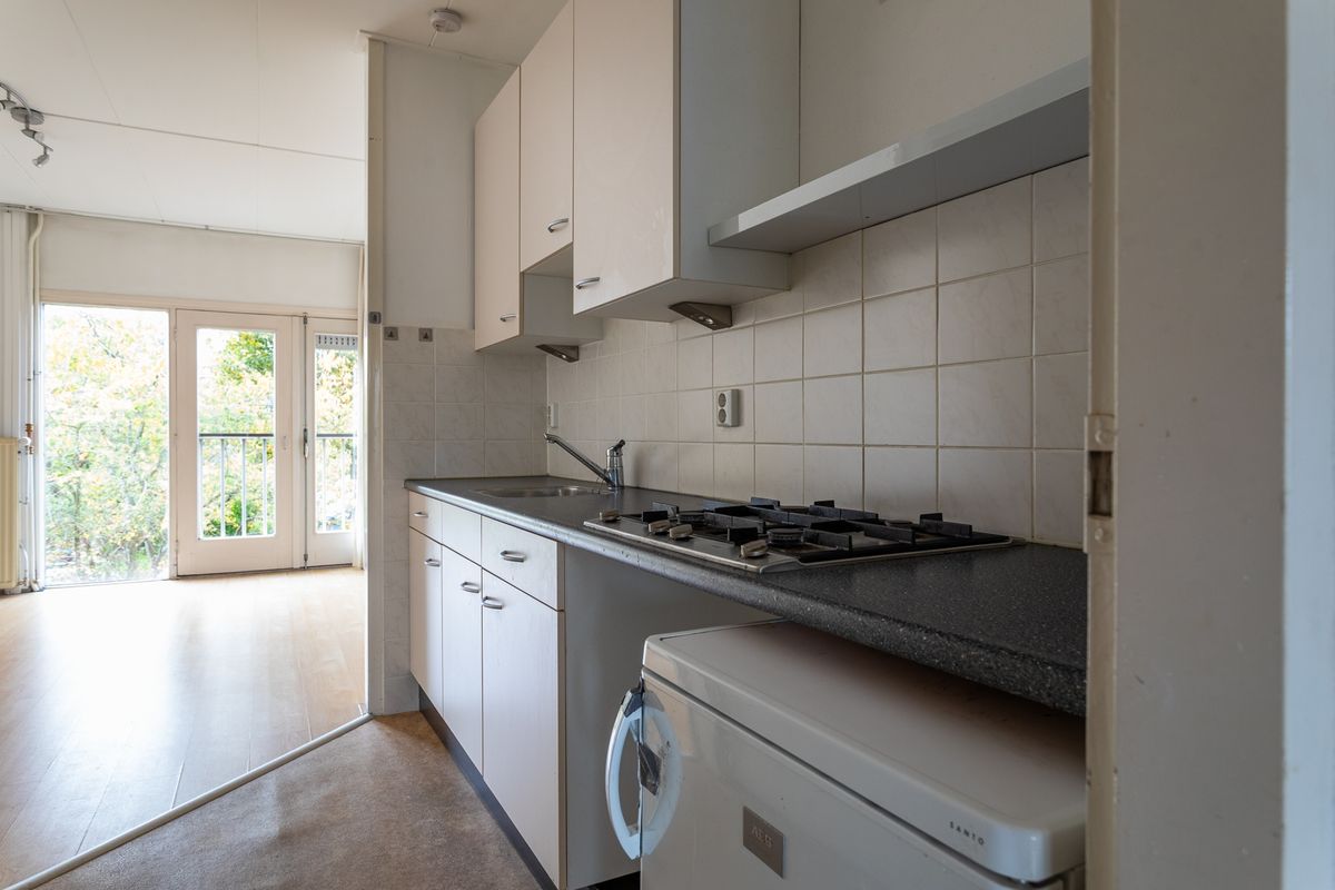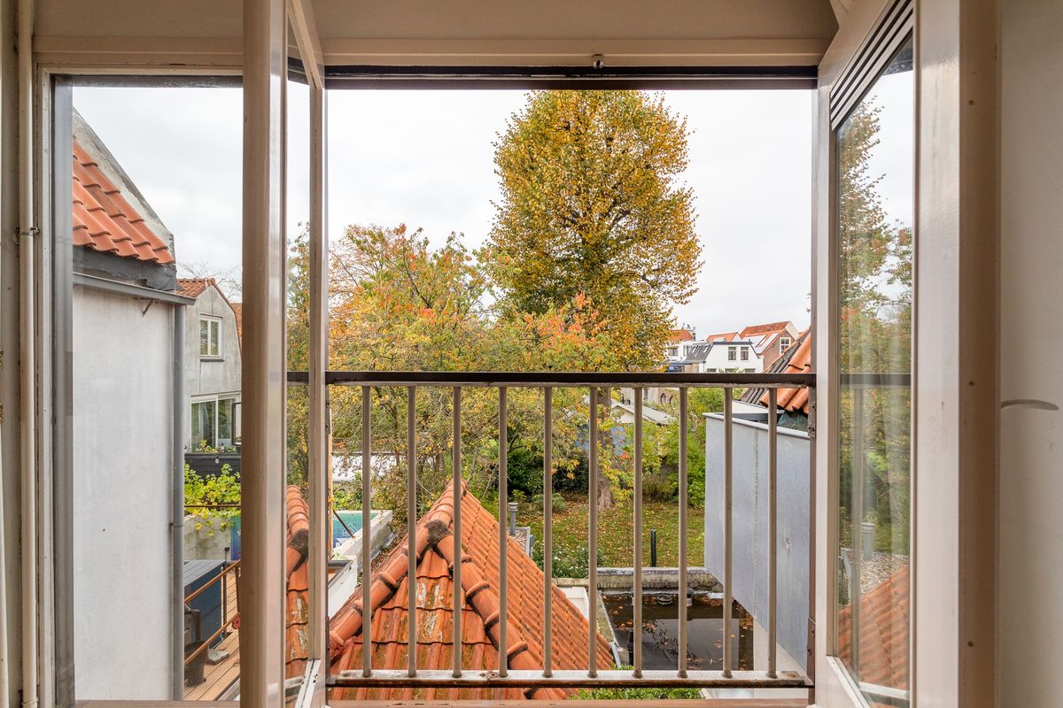Je komt binnen in de keuken, die is voorzien van inbouwapparatuur en voldoende kastruimte. Aan de achterzijde bevindt zich de lichte woonkamer met openslaande deuren naar een Frans balkon — een fijne plek om de deuren open te zetten en te genieten van het uitzicht over de gracht.