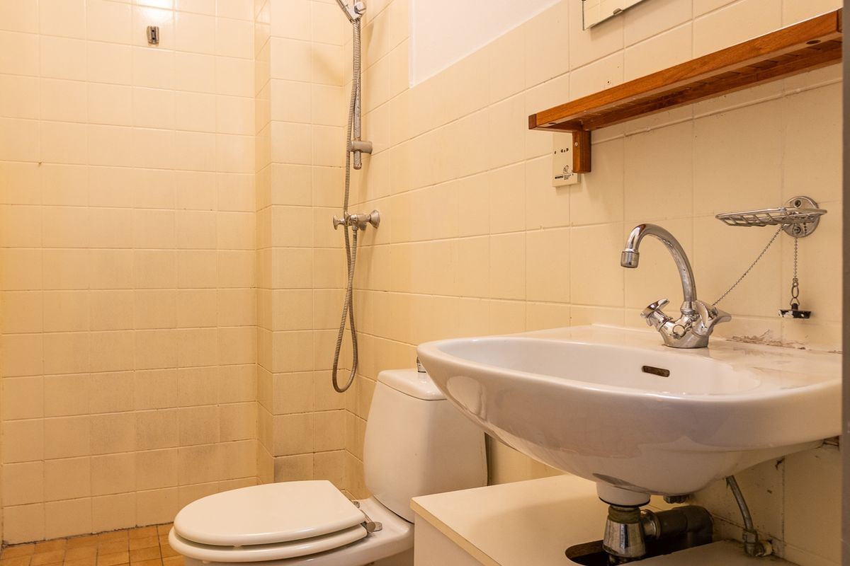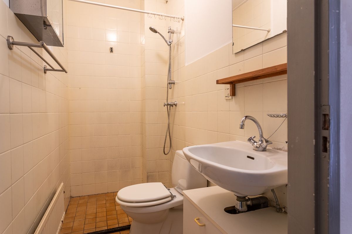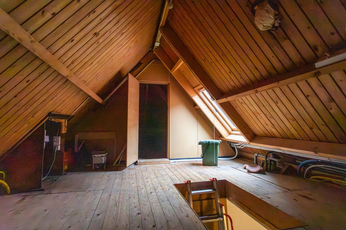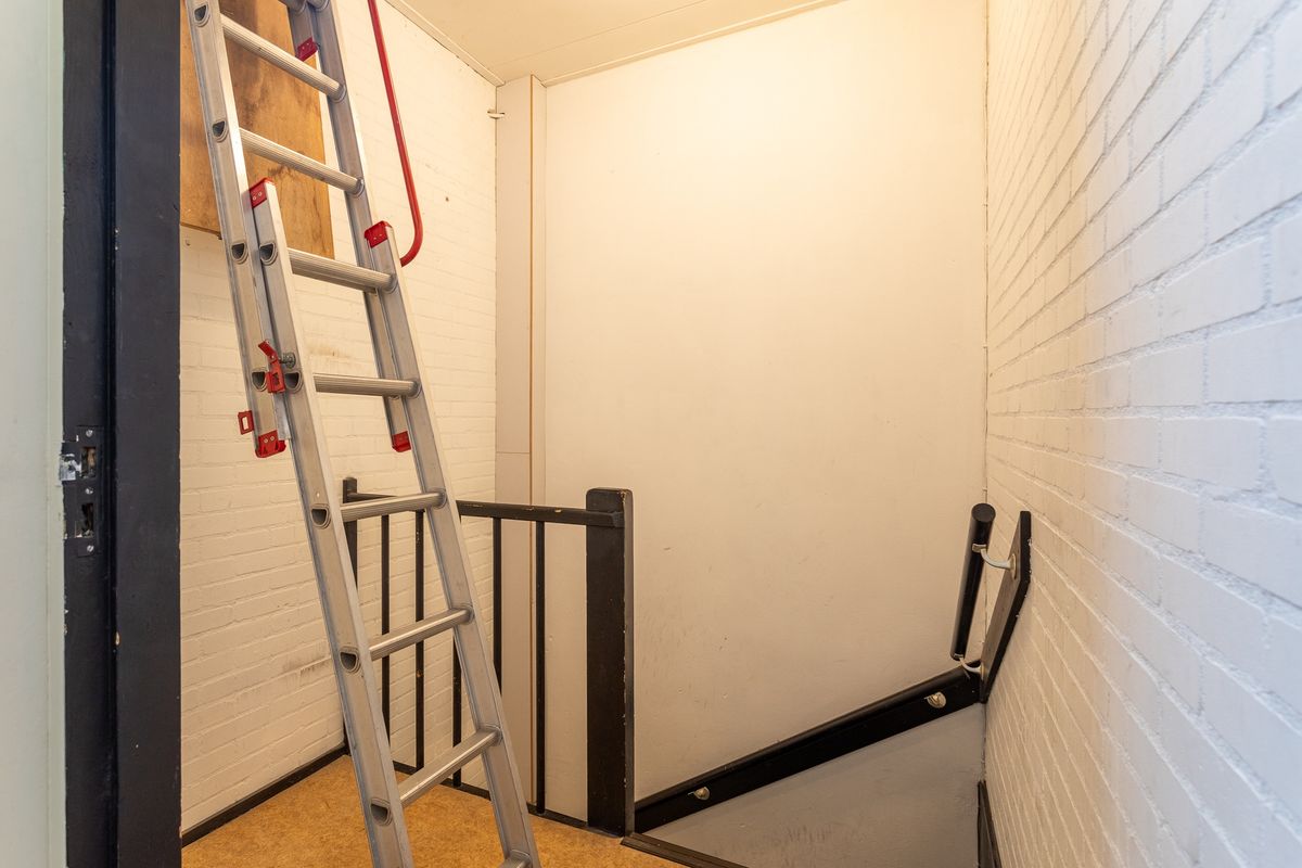 Aan de voorzijde ligt de slaapkamer, rustig gelegen en van goed formaat. In de hal bevindt zich de badkamer met douche, wastafel en toilet. Via het kleine halletje bij de entree is een losse trap naar de vliering/zolder, die extra bergruimte biedt.