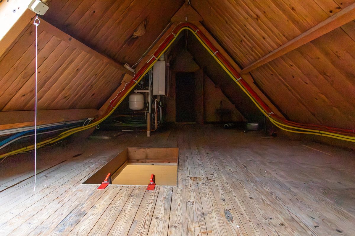 The bedroom, located at the front, is quiet and well-proportioned. The bathroom with shower, washbasin, and toilet is situated off the hallway. A small hall near the entrance provides access to a loft via a pull-down ladder, offering additional storage space.