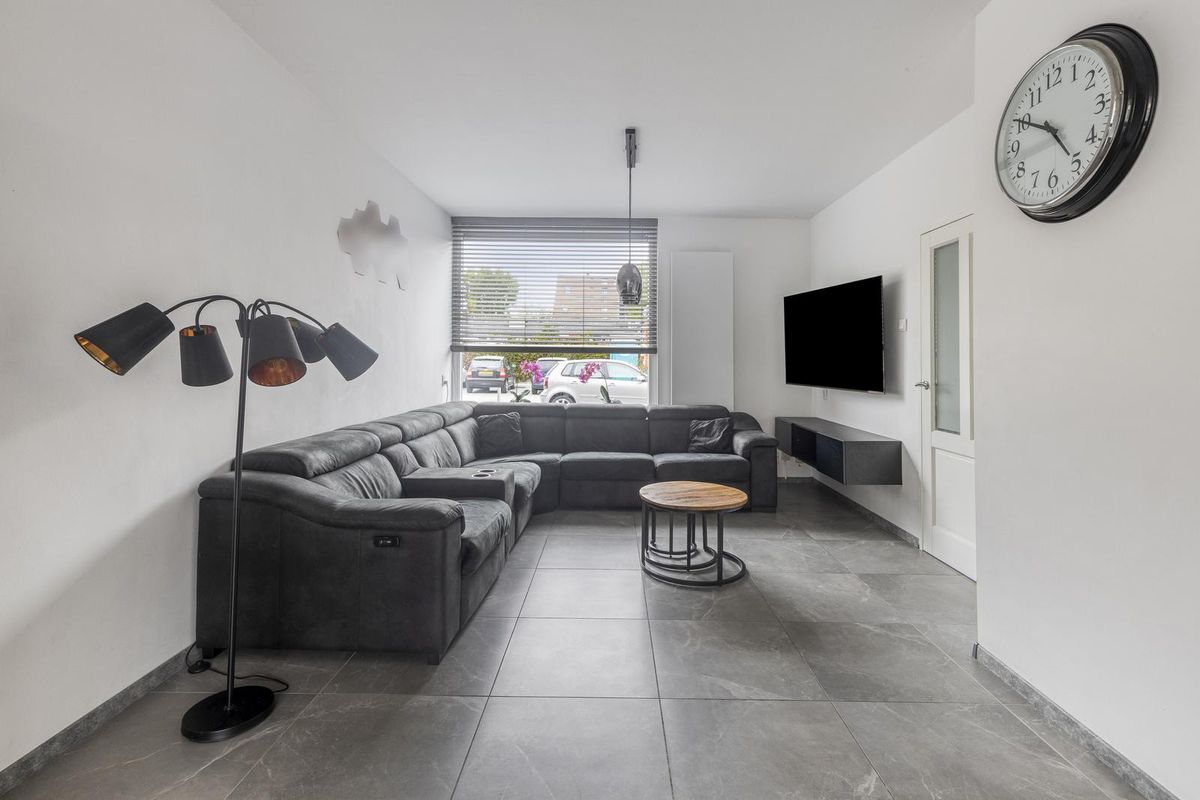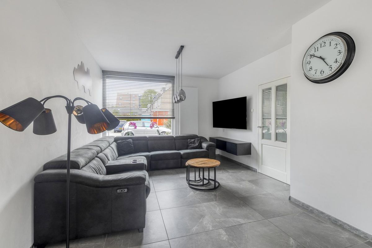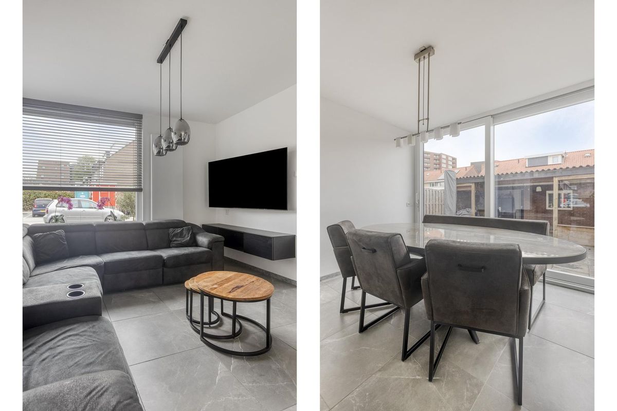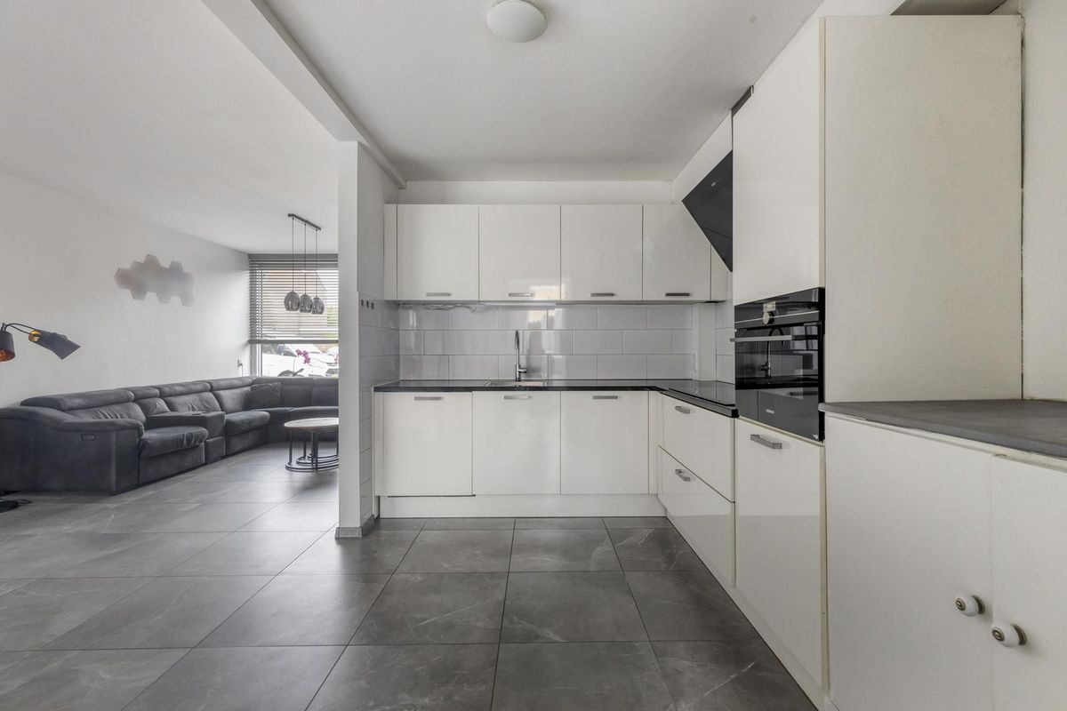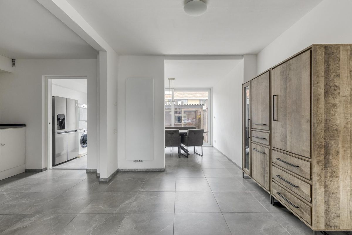Wat direct opvalt in de woonkamer is de ruimte en het licht. De strak gestucte wanden en de grijze tegelvloer zorgen voor een moderne uitstraling. Dankzij de uitbouw is er plek voor een royaal eetgedeelte, compleet met vloerverwarming en schuifpui naar de tuin. De open keuken in frisse witte tinten is voorzien van inbouwapparatuur en vormt een fijne plek om uitgebreid te koken en gezellig samen te zijn.