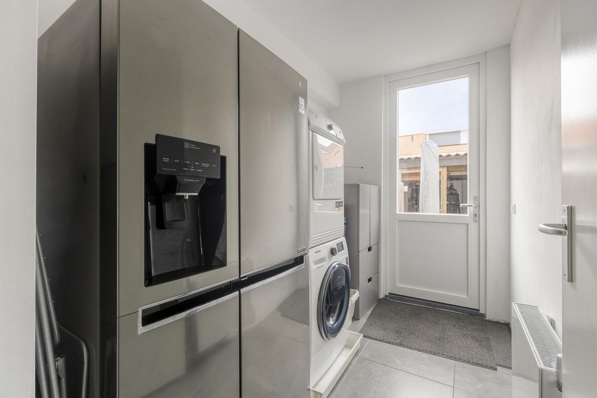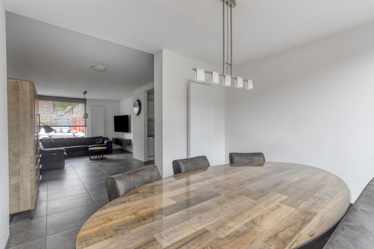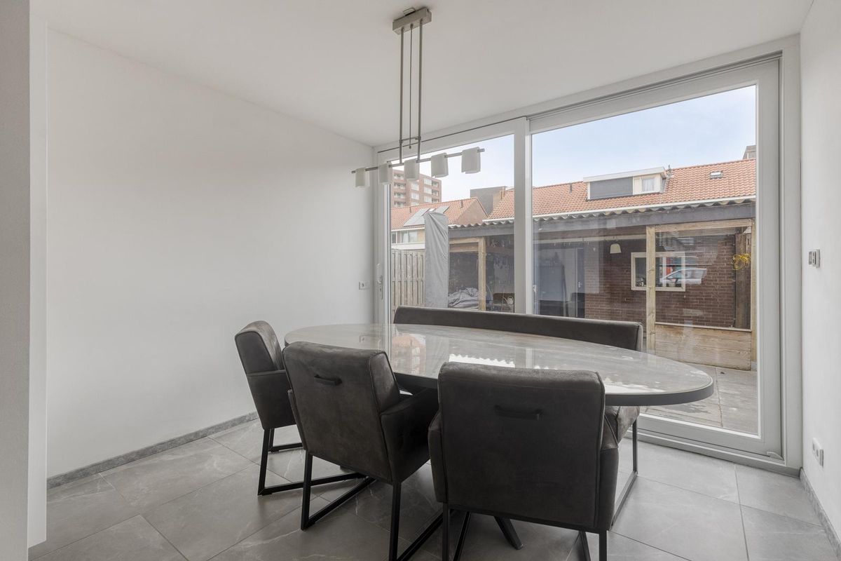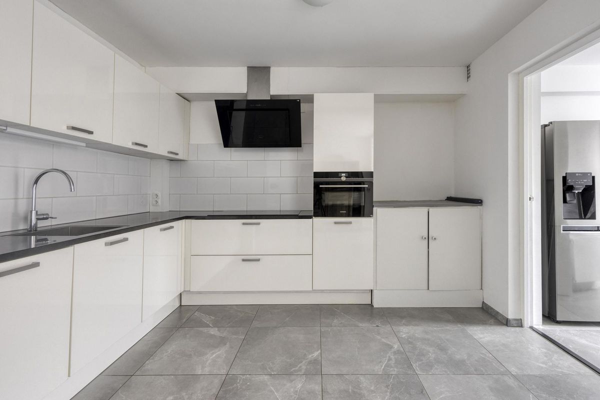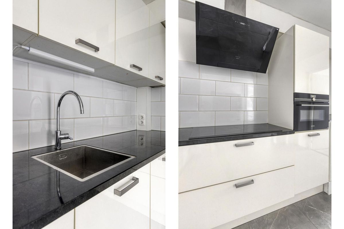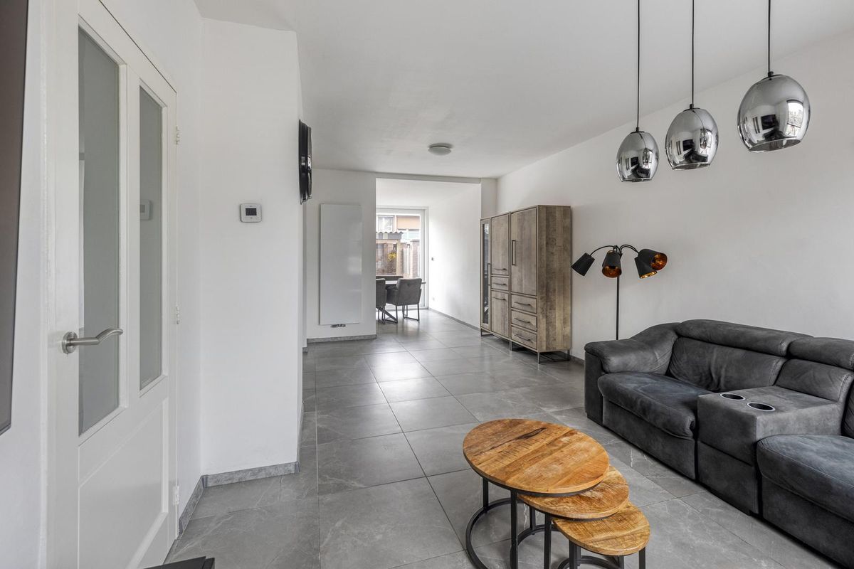 Wat direct opvalt in de woonkamer is de ruimte en het licht. De strak gestucte wanden en de grijze tegelvloer zorgen voor een moderne uitstraling. Dankzij de uitbouw is er plek voor een royaal eetgedeelte, compleet met vloerverwarming en schuifpui naar de tuin. De open keuken in frisse witte tinten is voorzien van inbouwapparatuur en vormt een fijne plek om uitgebreid te koken en gezellig samen te zijn.