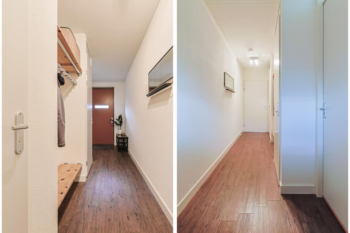 Via de centrale entree met bellenplateau, lift en trappenhuis bereik je de eerste verdieping. Je komt het appartement binnen in de hal met meterkast en met toegang tot de woonkamer. De woonkamer ligt aan de achterzijde en heeft dankzij het grote schuifraam een fijne lichtinval, uitzicht over een groenstrook en richting de dijk en het centrum van Nieuwkoop. De ligging op de eerste verdieping zorgt voor een open gevoel, zonder directe inkijk.